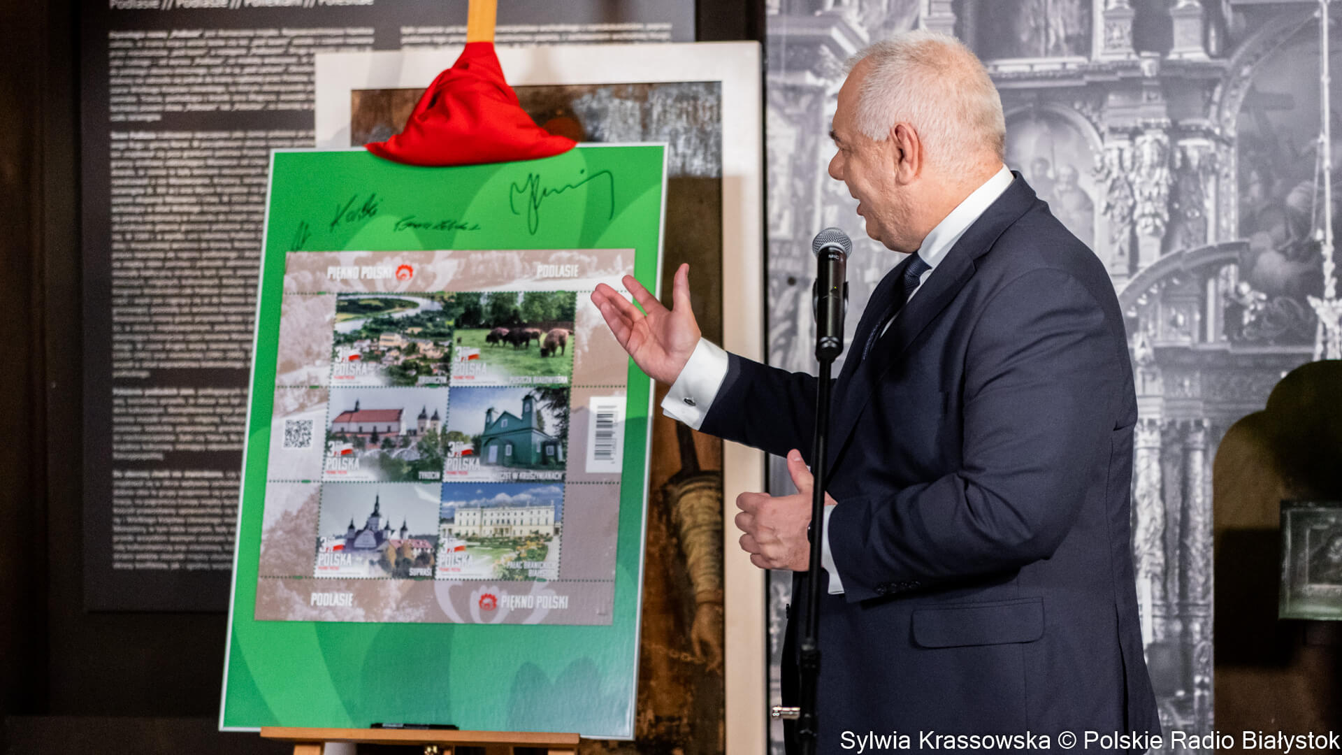 - To jest dobra promocja województwa podlaskiego (...), można zobaczyć na tych znaczkach wiele wspaniałych miejsc, wiele perełek architektonicznych, unikalną, wyjątkową przyrodę, to, co jest najpiękniejsze w województwie podlaskim - mówił marszałek. Reklamował Podlaskie jako "najlepsze miejsce do życia", podkreślając m.in. gościnność mieszkańców.