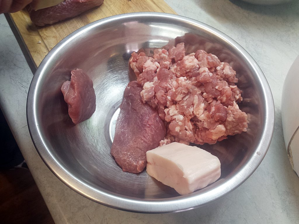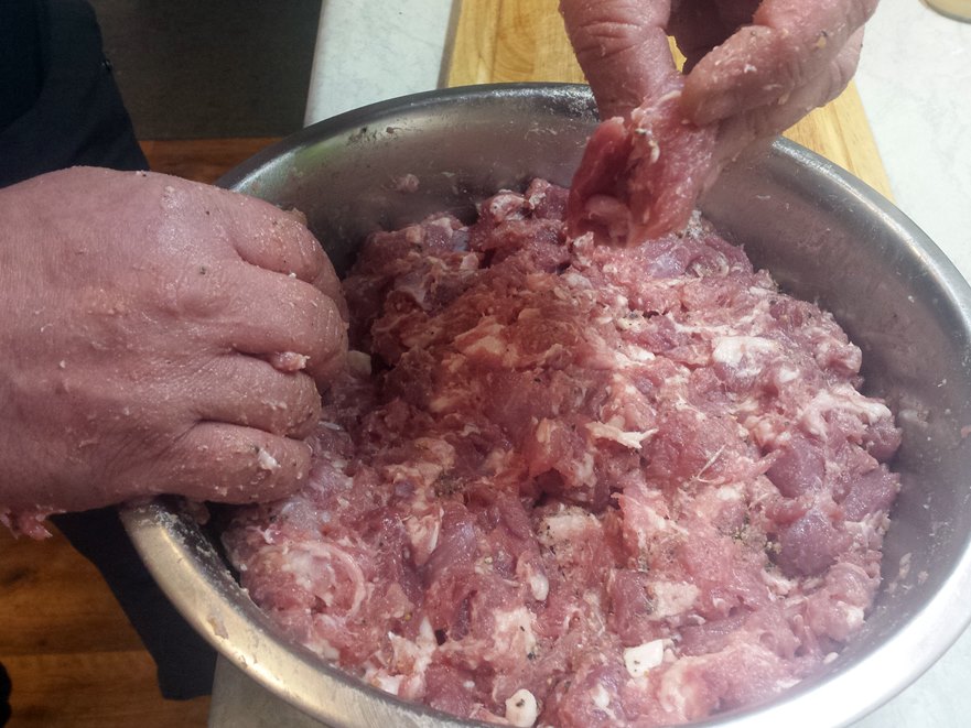 Mięso przygotowujemy dzień przed nadziewaniem go do jelit. Część mięsa z elementami tłustymi i słoniną mielimy przez sitko o grubych oczkach. Drugą część kroimy w dość dużą kostkę. W szklance zimnej wody rozpuszczamy sól (na 5 kg mięsa 6 łyżeczek soli i 3 łyżeczki cukru). Wlewamy to do miski z mięsem. Długo mieszamy, aż pojawi się tzw. klej. Na całą noc odstawiamy do lodówki. Na drugi dzień oddajemy czarny pieprz i gorczycę (zmiażdżoną w moździerzu). Jeśli mięso jest za mało doprawione, to znowu można dodać wodę z rozpuszczoną solą i cukrem. Następnie mięsem nadziewamy wymoczone wcześniej jelita. Tak przygotowaną kiełbasę gotujemy lub pieczemy. Podajemy z sosem.