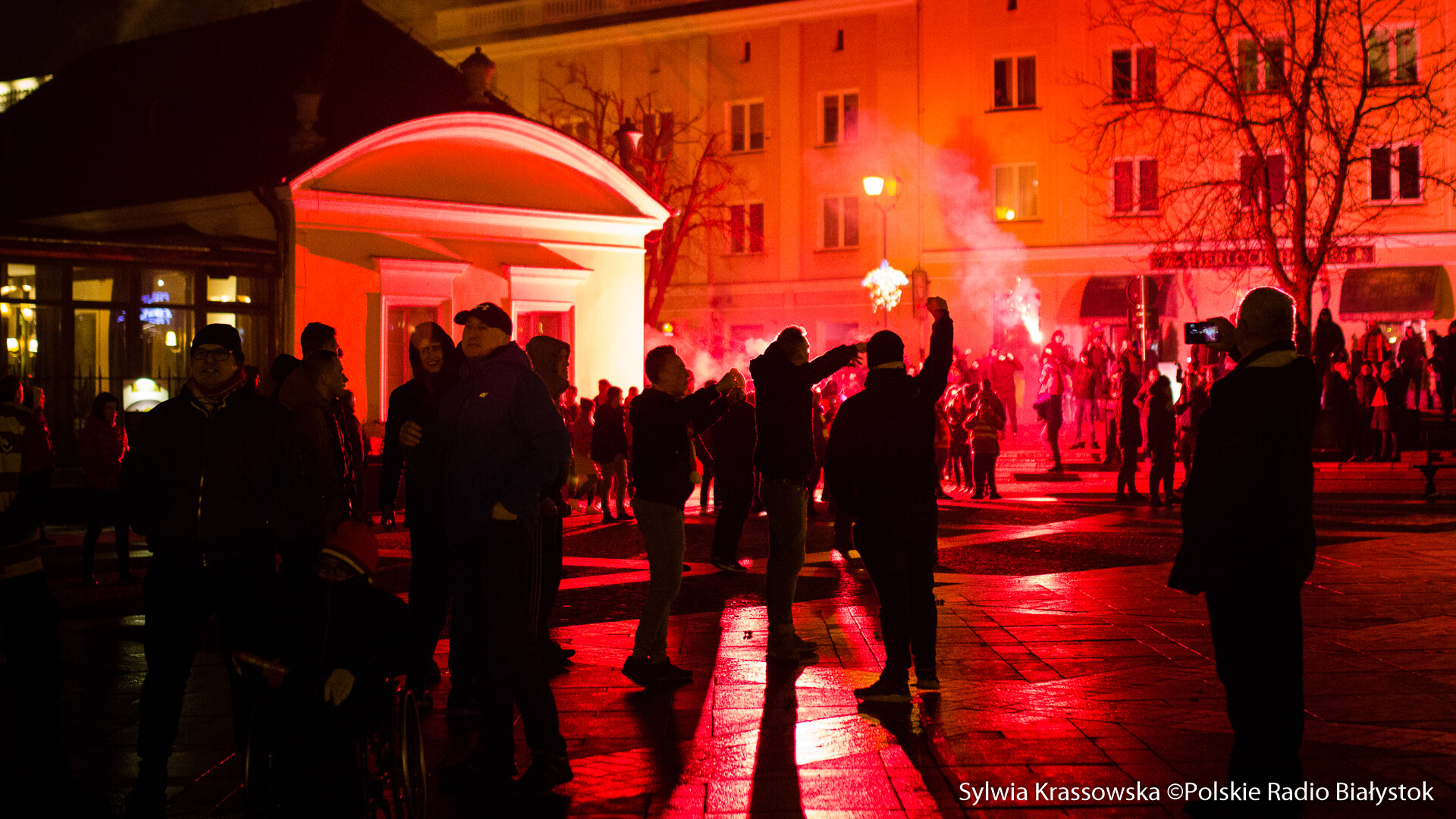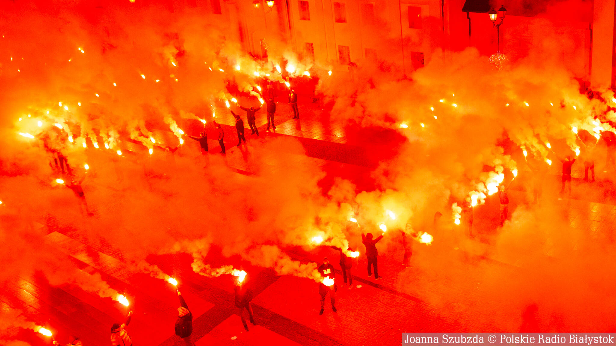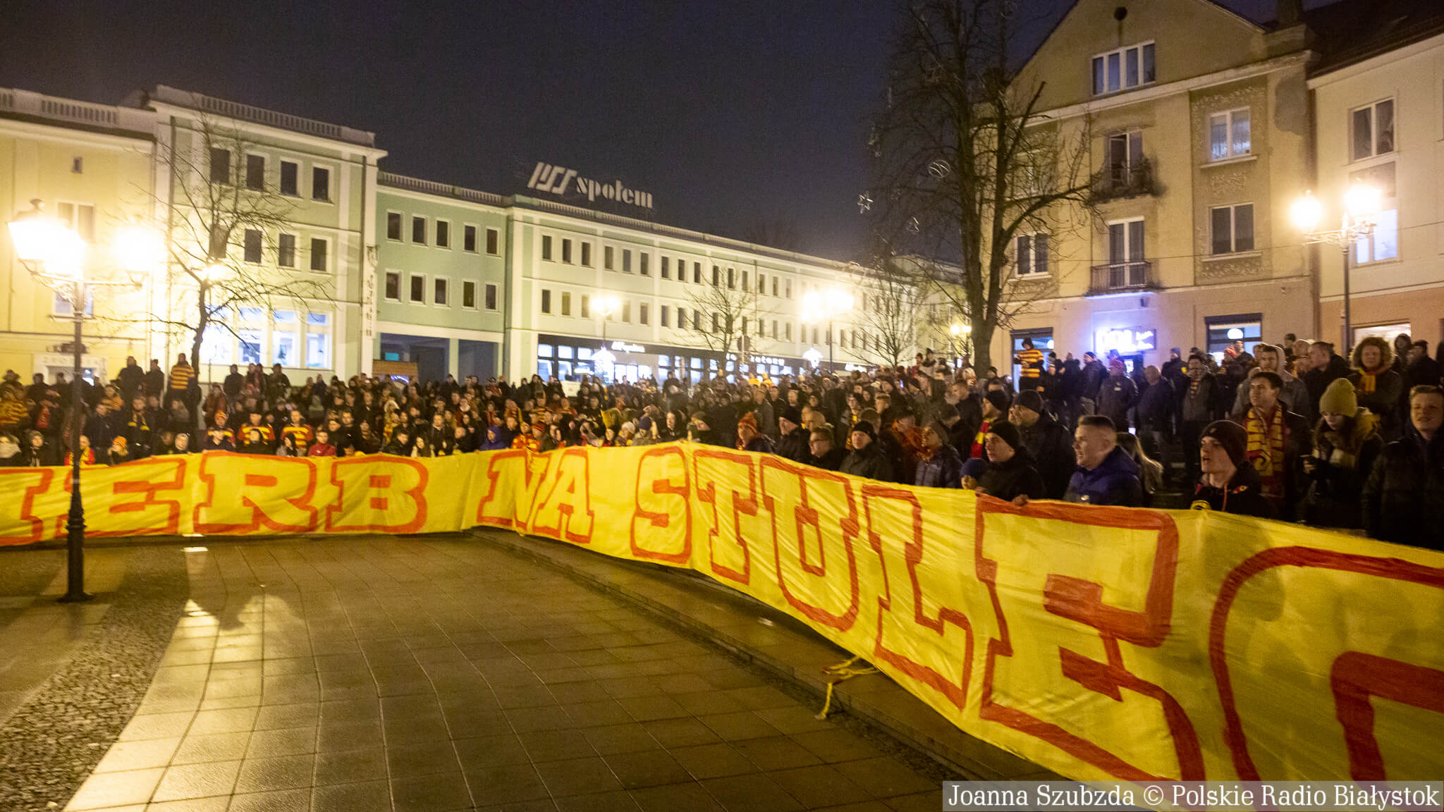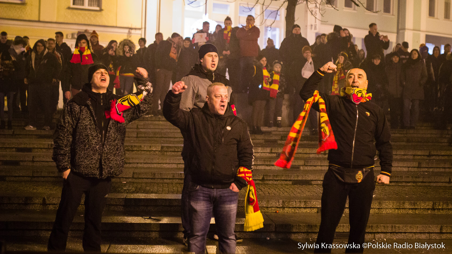Na jednej części Rynku Kościuszki kibice ustawili się z zapalonymi racami tworząc 1920. "Jagiellonia - to my, to my, to my!", "Nasza Jaga najlepsza w Polsce jest!", "BKS, BKS!" - skandowali. Choć w planie były jedynie race, kilka razy wystrzeliły też petardy.W akcji wzięło udział kilkuset kibiców.