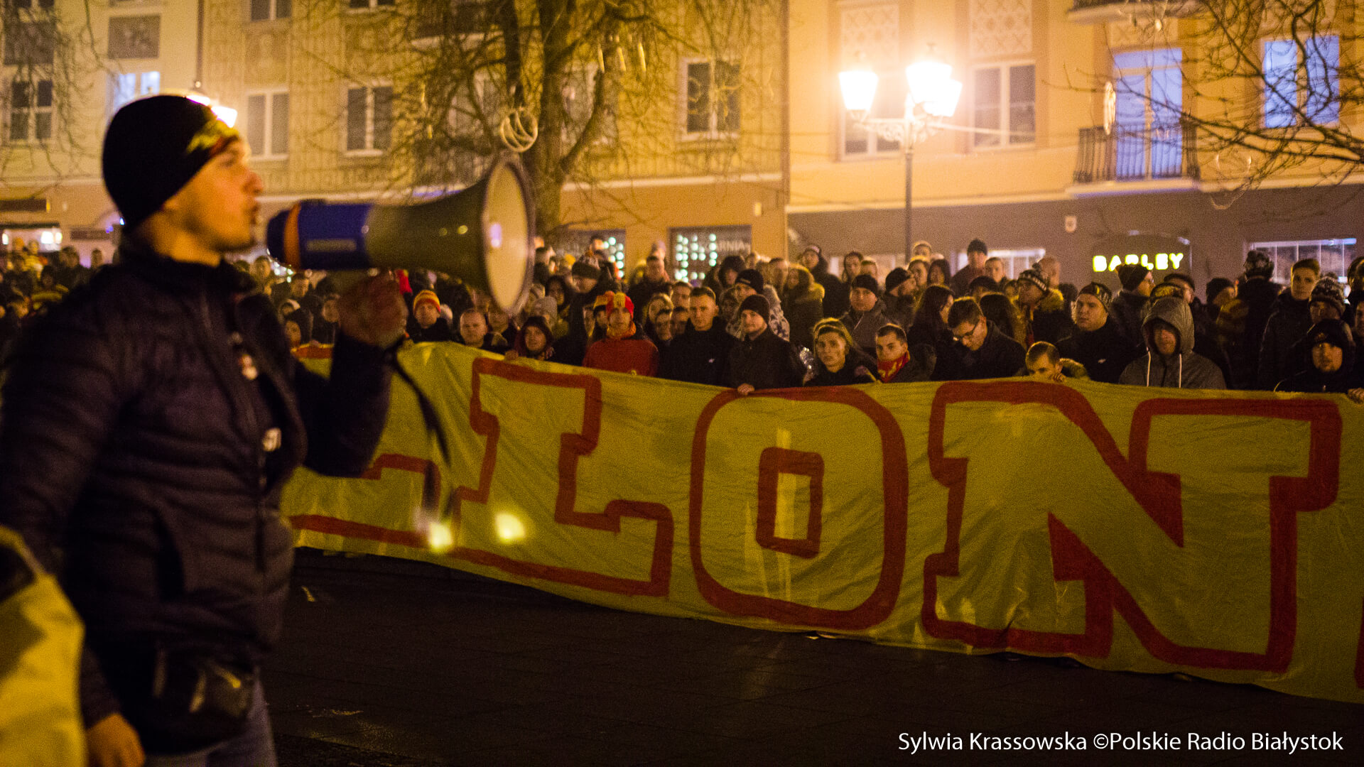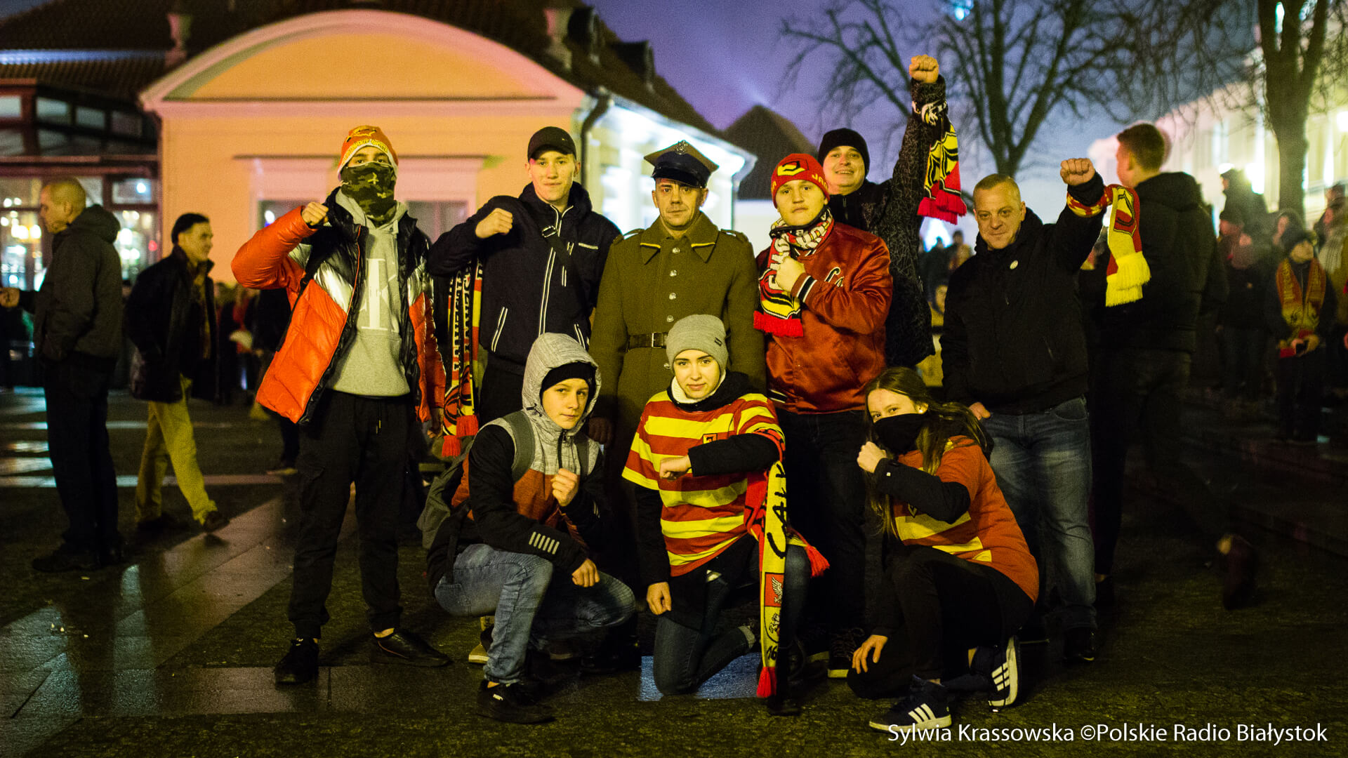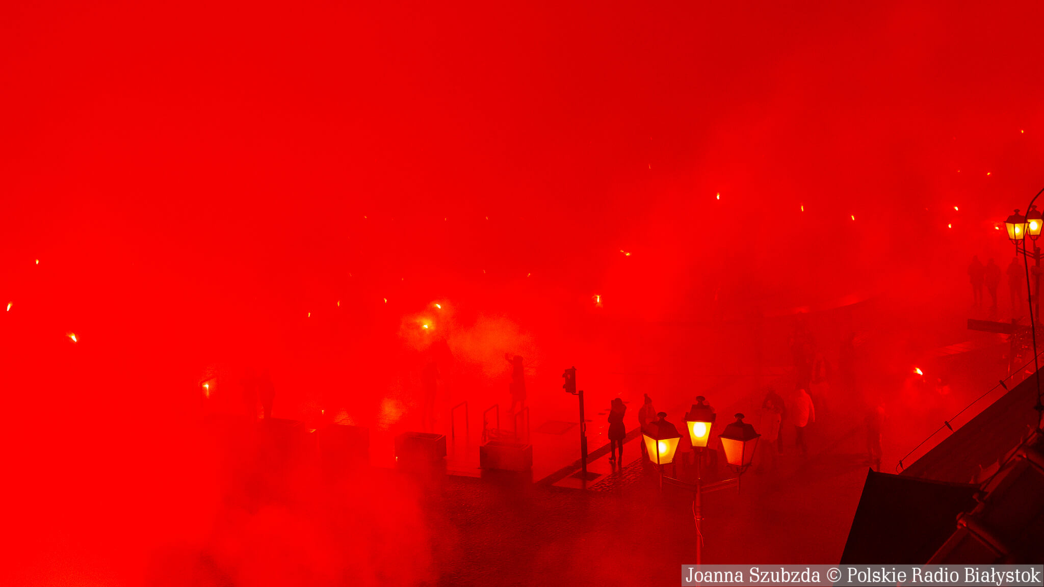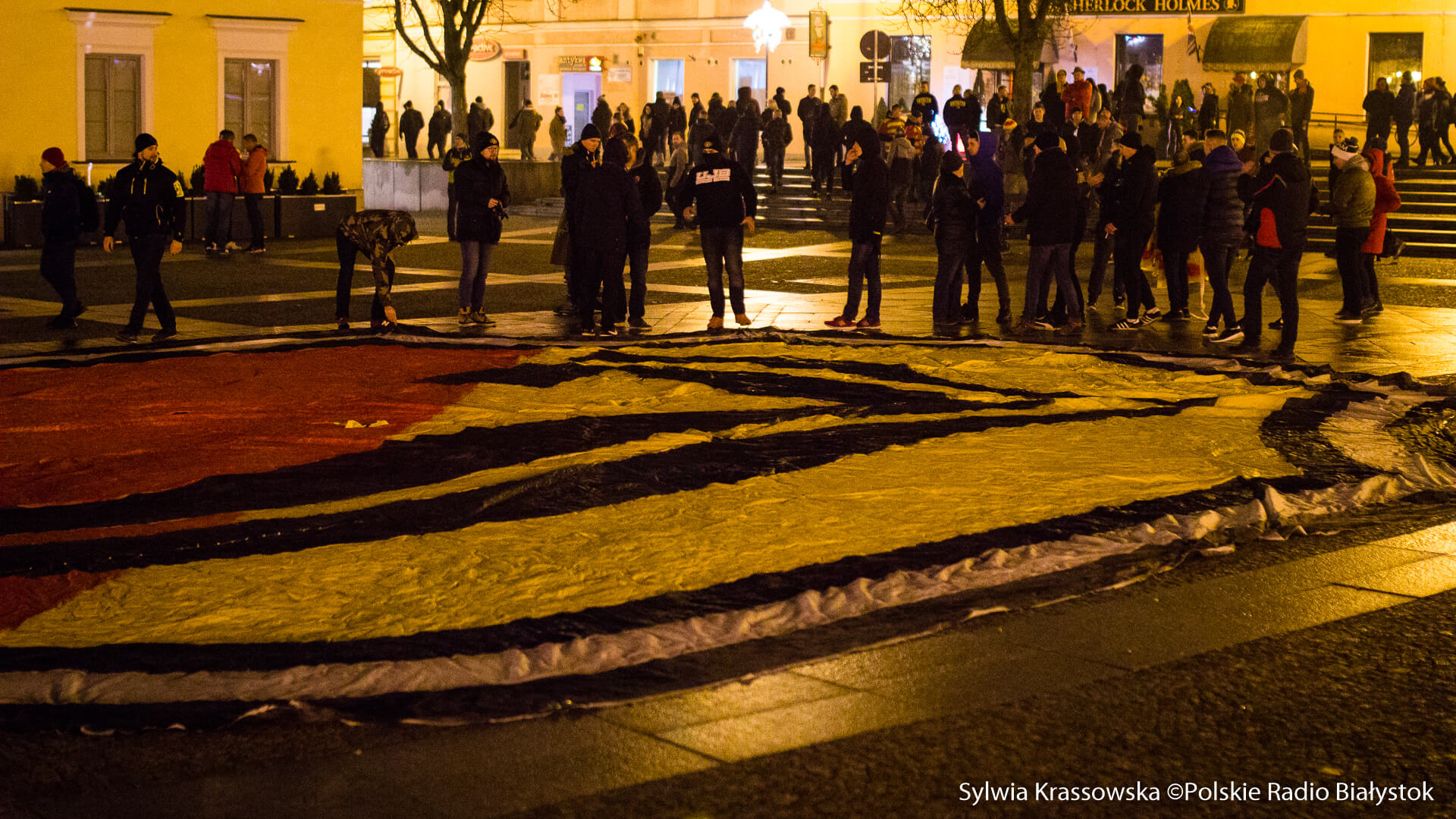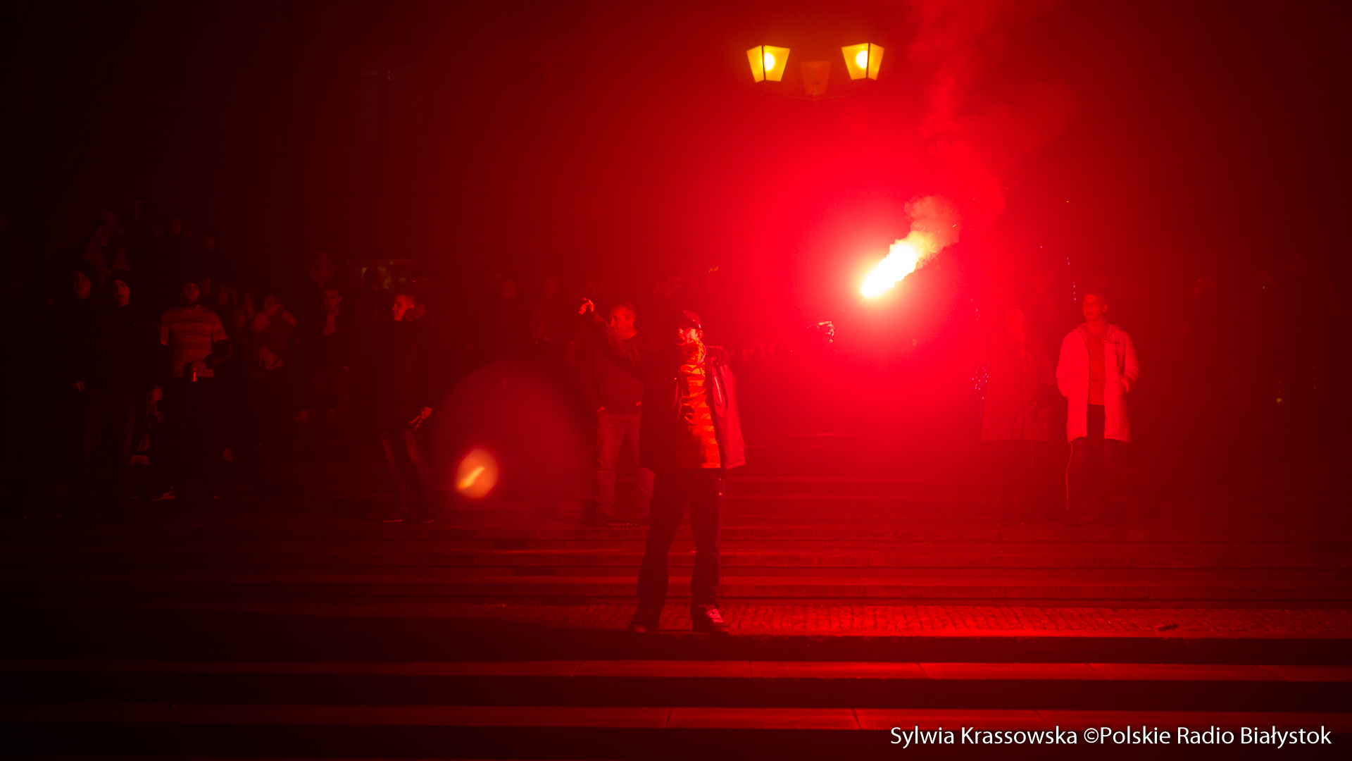 Na jednej części Rynku Kościuszki kibice ustawili się z zapalonymi racami tworząc 1920. "Jagiellonia - to my, to my, to my!", "Nasza Jaga najlepsza w Polsce jest!", "BKS, BKS!" - skandowali. Choć w planie były jedynie race, kilka razy wystrzeliły też petardy.W akcji wzięło udział kilkuset kibiców.