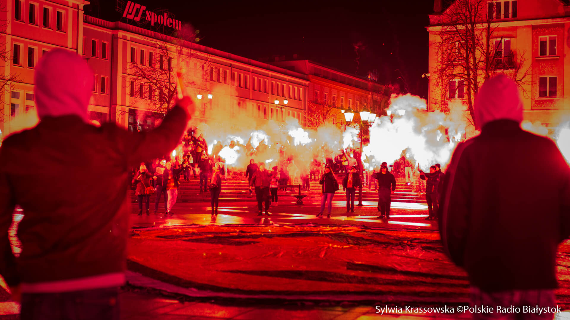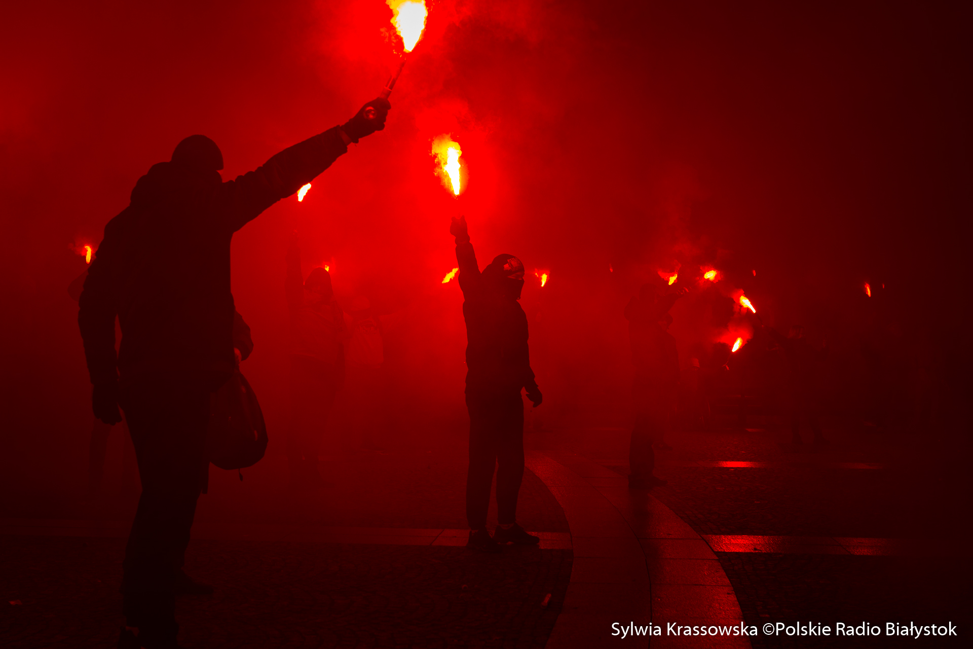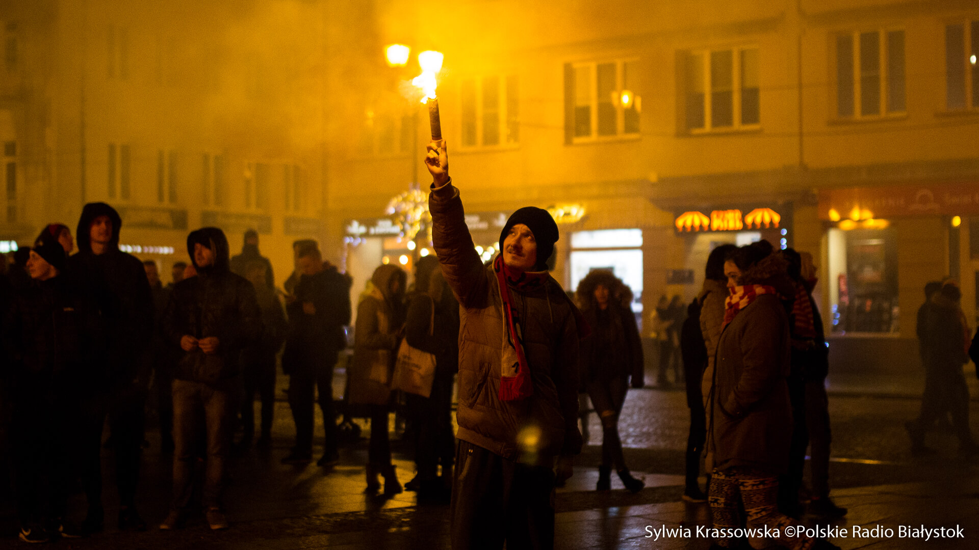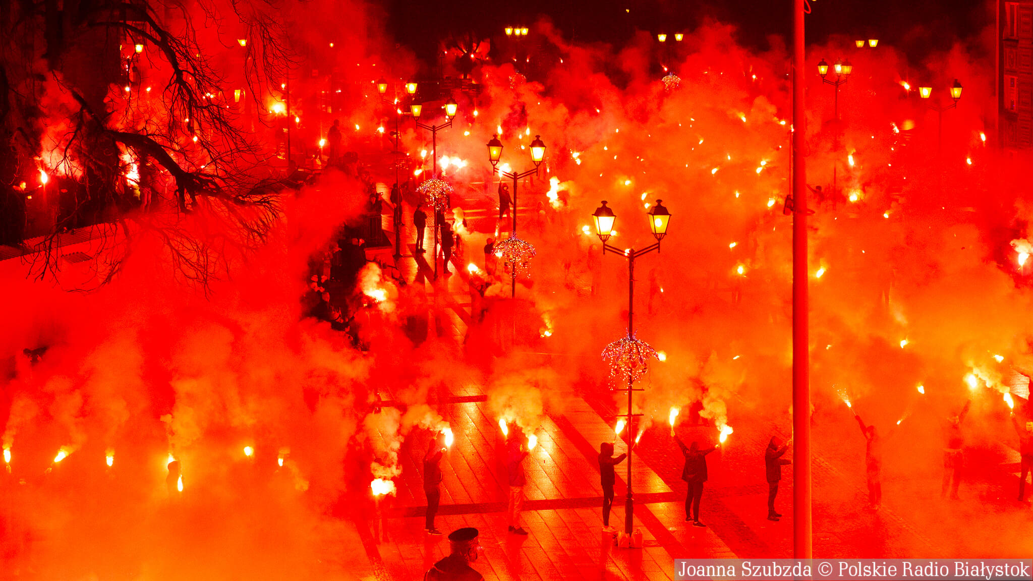 Na jednej części Rynku Kościuszki kibice ustawili się z zapalonymi racami tworząc 1920. "Jagiellonia - to my, to my, to my!", "Nasza Jaga najlepsza w Polsce jest!", "BKS, BKS!" - skandowali. Choć w planie były jedynie race, kilka razy wystrzeliły też petardy.W akcji wzięło udział kilkuset kibiców.