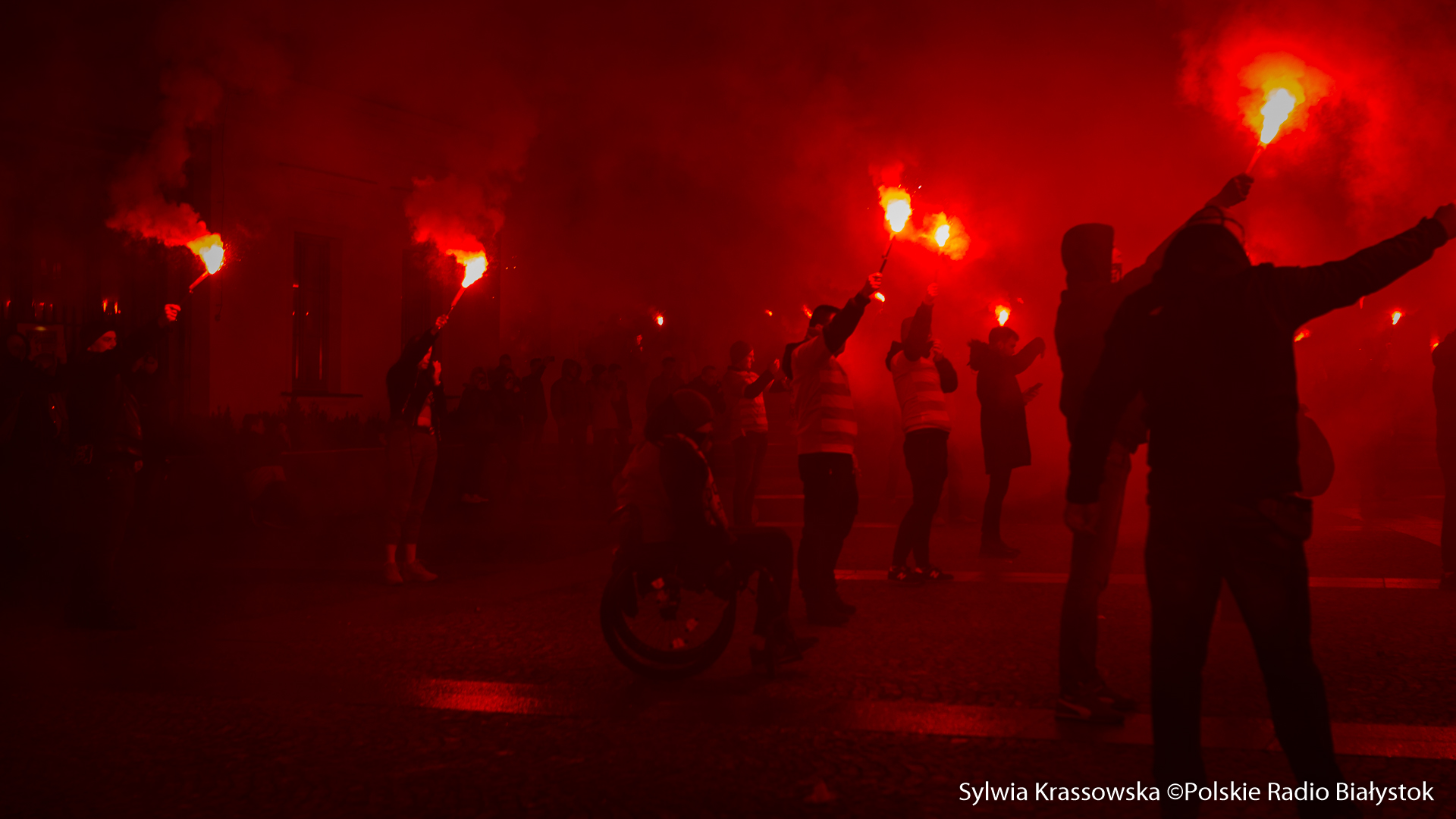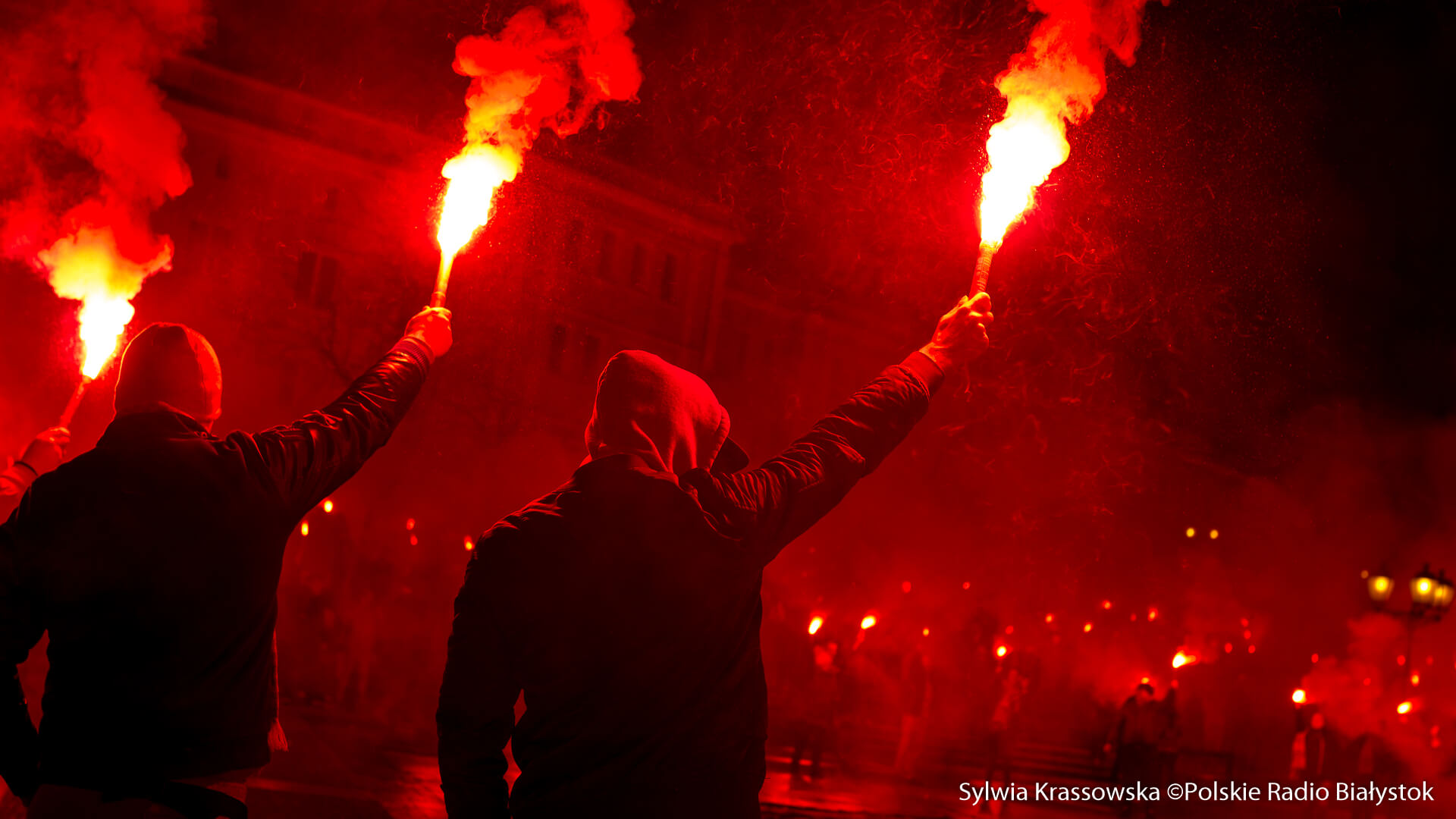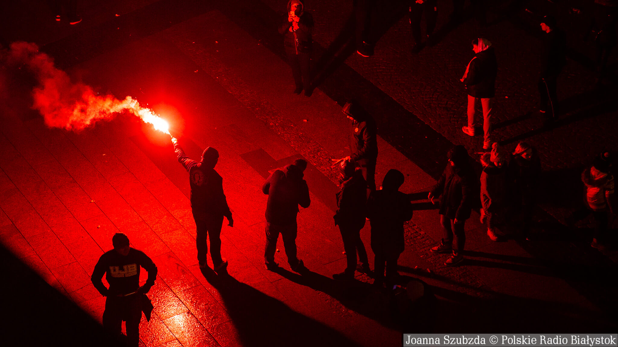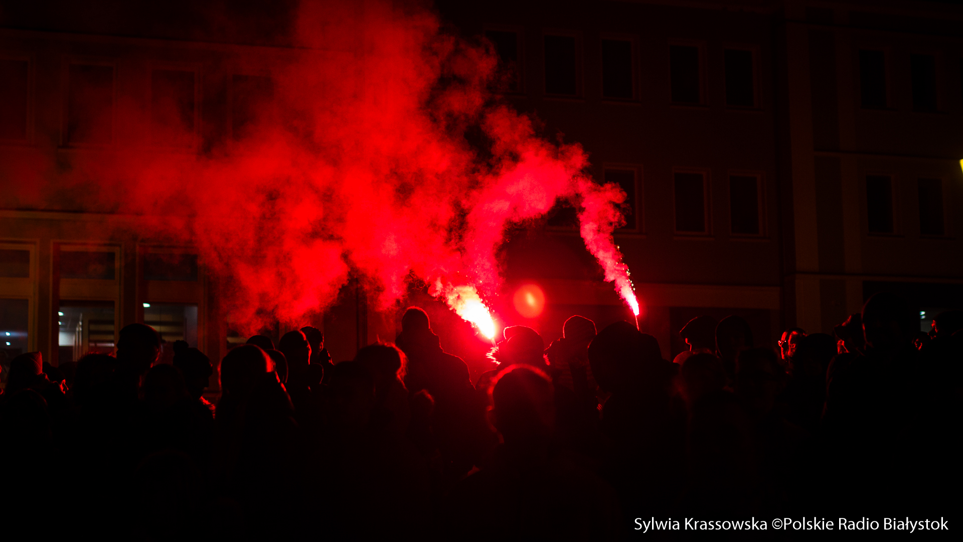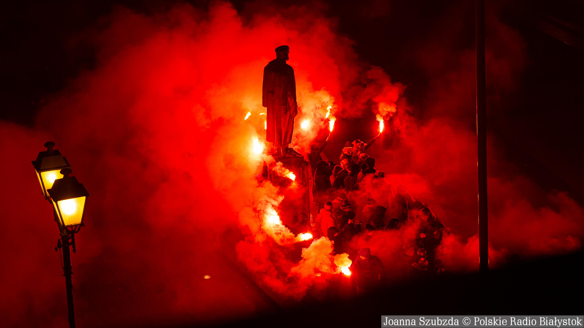 Na jednej części Rynku Kościuszki kibice ustawili się z zapalonymi racami tworząc 1920. "Jagiellonia - to my, to my, to my!", "Nasza Jaga najlepsza w Polsce jest!", "BKS, BKS!" - skandowali. Choć w planie były jedynie race, kilka razy wystrzeliły też petardy.W akcji wzięło udział kilkuset kibiców.