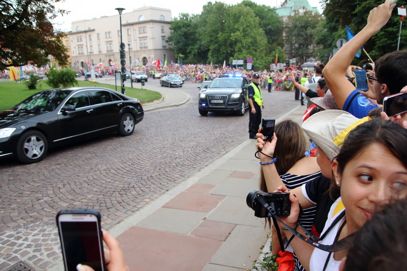 Z lotniska papież wyjechał czarnym Volkswagenem Golfem. Pod Kościołem Najświętszego Salwatora przesiadł się do papamobile. Około 17:20 papamobile z Franciszkiem dotarło na Wawel, gdzie papieża ponownie przywitała para prezydencka. Byli też liczni przedstawiciele władz centralnych, lokalnych, sądownictwa, korpusu dyplomatycznego oraz Kościoła.