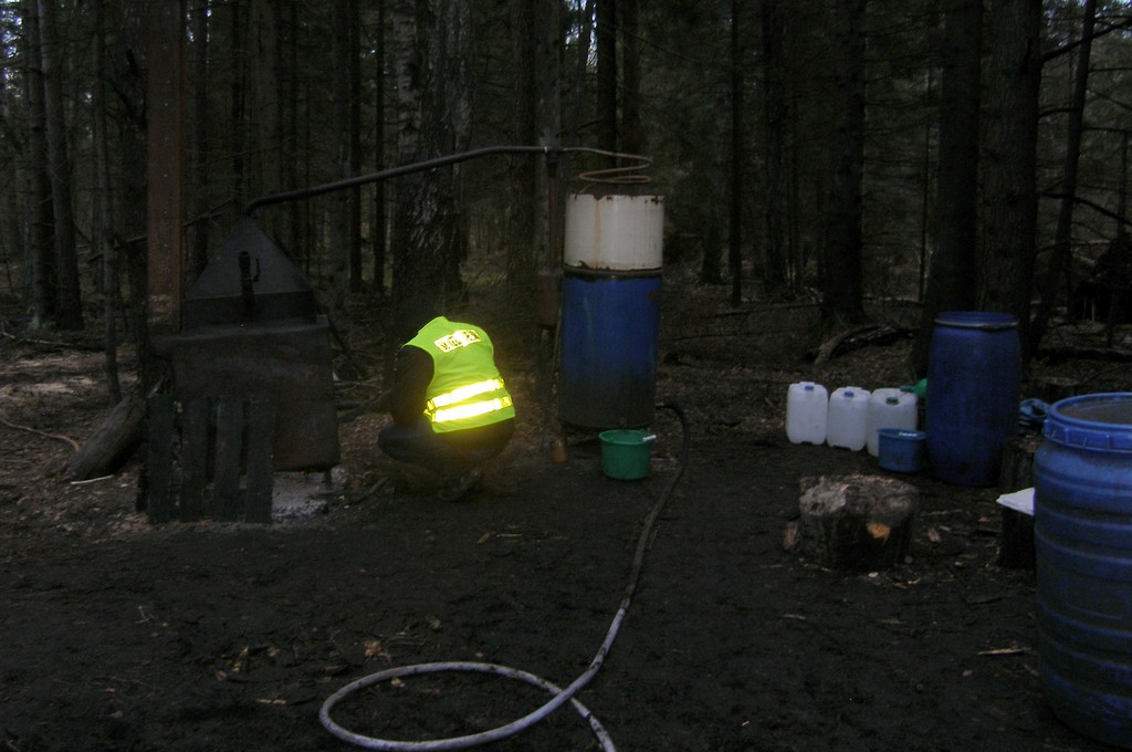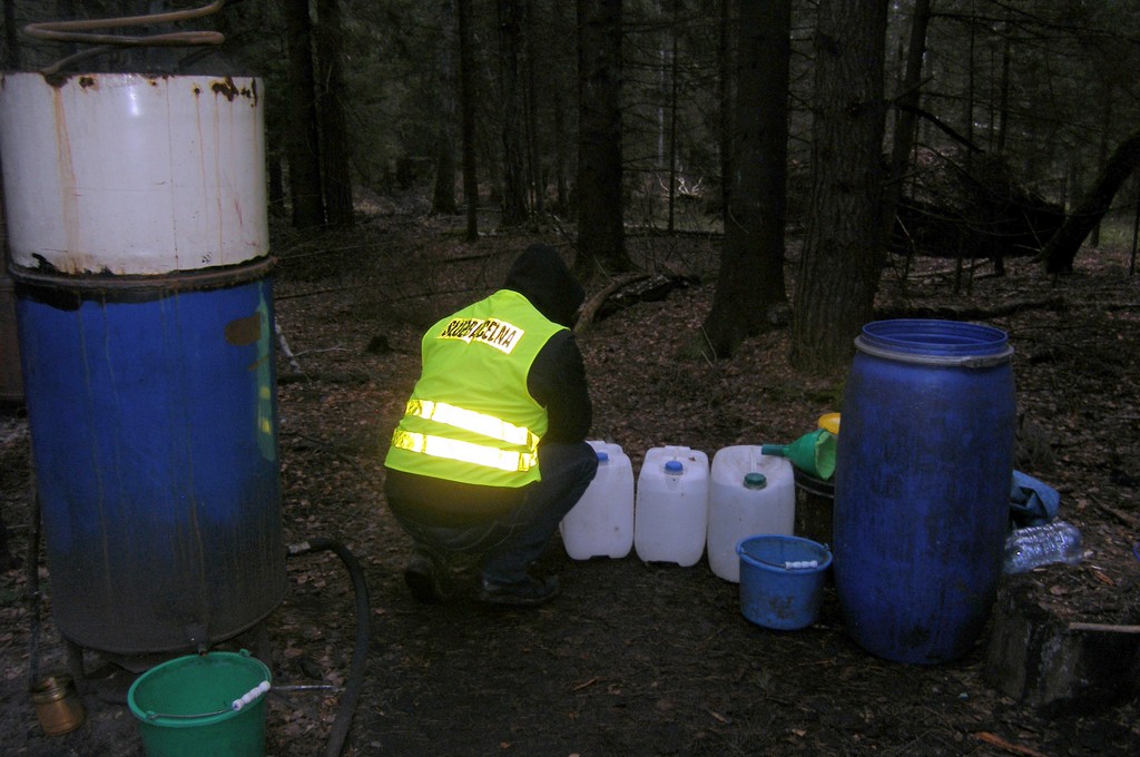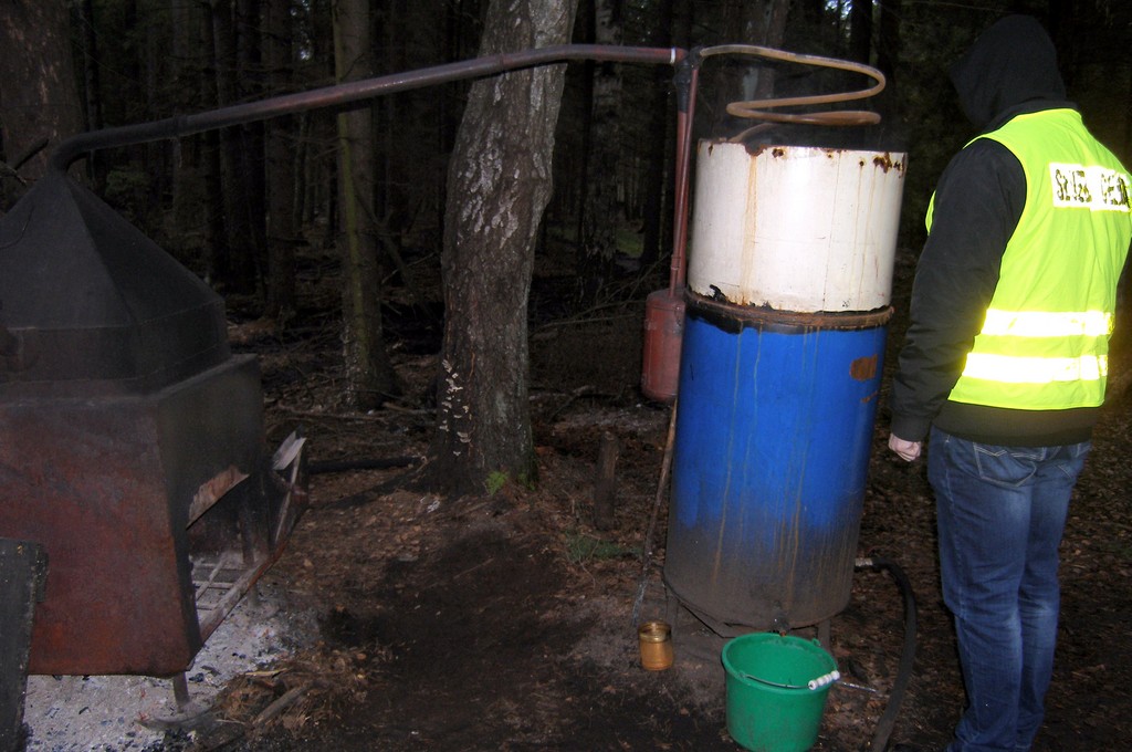 Oprócz sprzętu służącego do wytwarzania bimbru (kotła, pompy, alkoholomierzy i beczek) celnicy znaleźli na miejscu 50 litrów alkoholu o mocy 50 proc. Kolejne blisko 50 litrów celnicy wykryli w mieszkaniach bimbrowników.