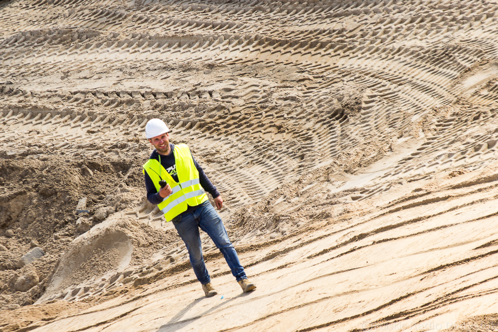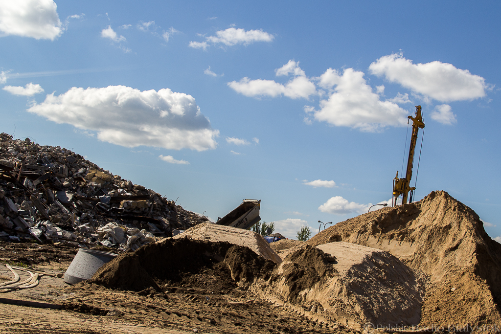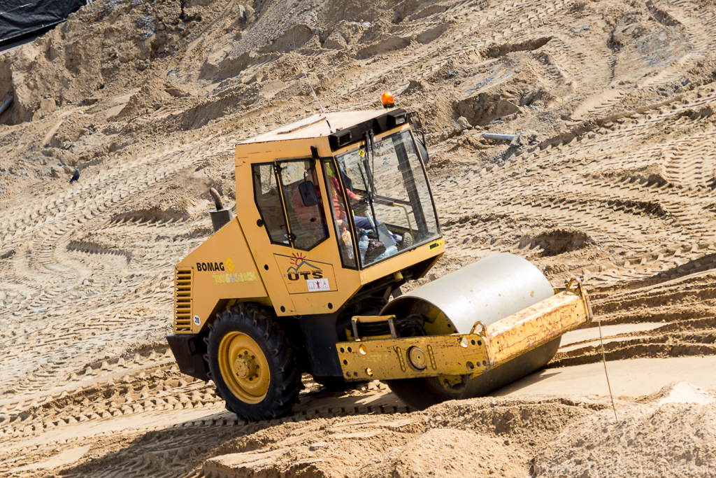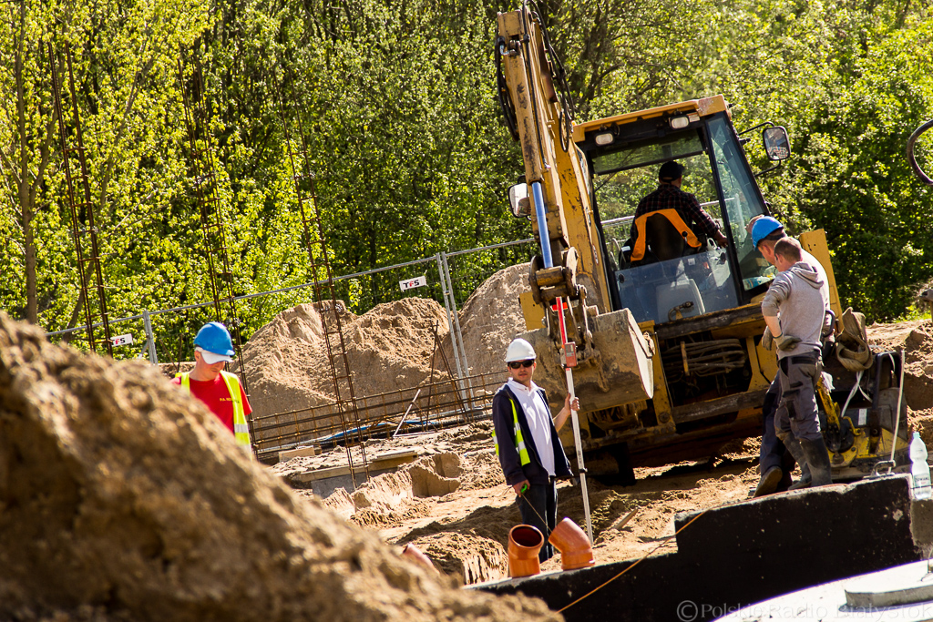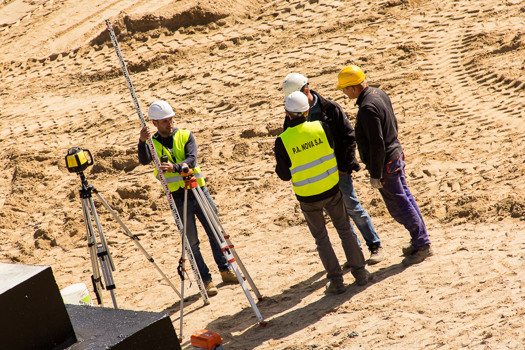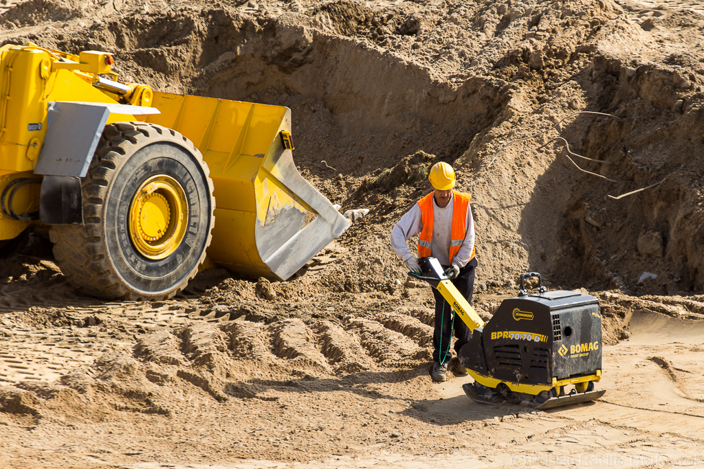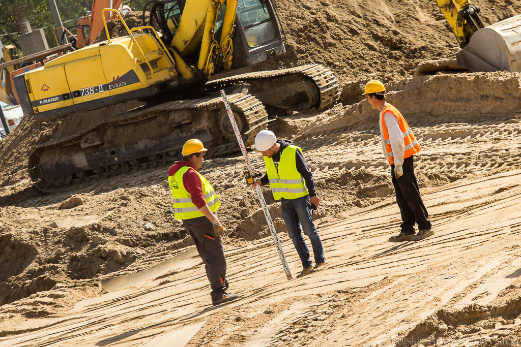Geodeci co chwila rozstawiają niwelatory, by określić różnice wysokości terenu, operatorzy koparek cierpliwie zagłębiają łyżki w górach ziemi, a robotnicy grabią piasek wyrównując teren.