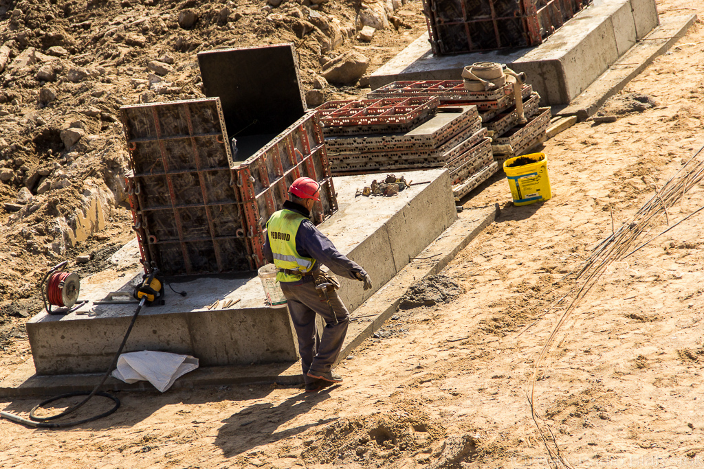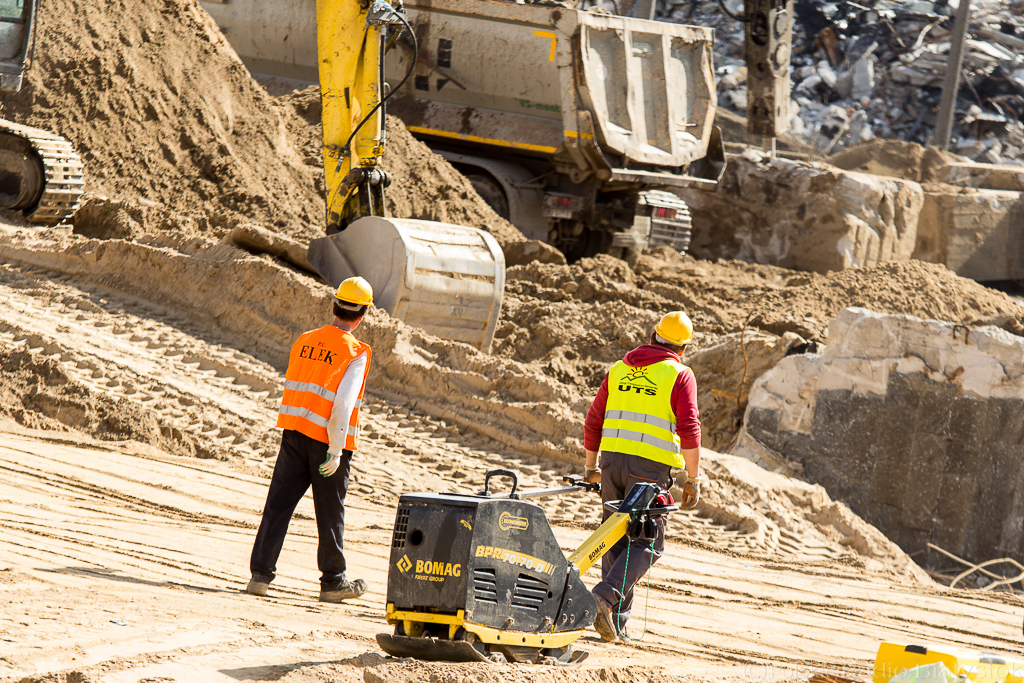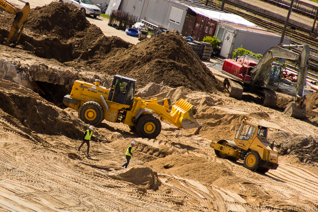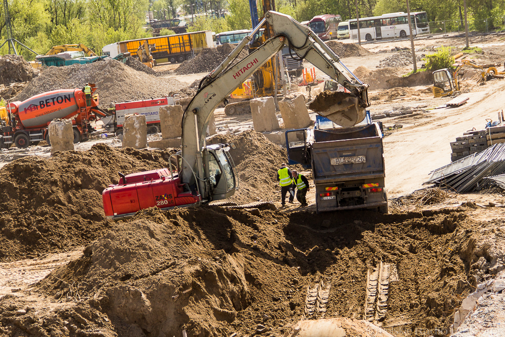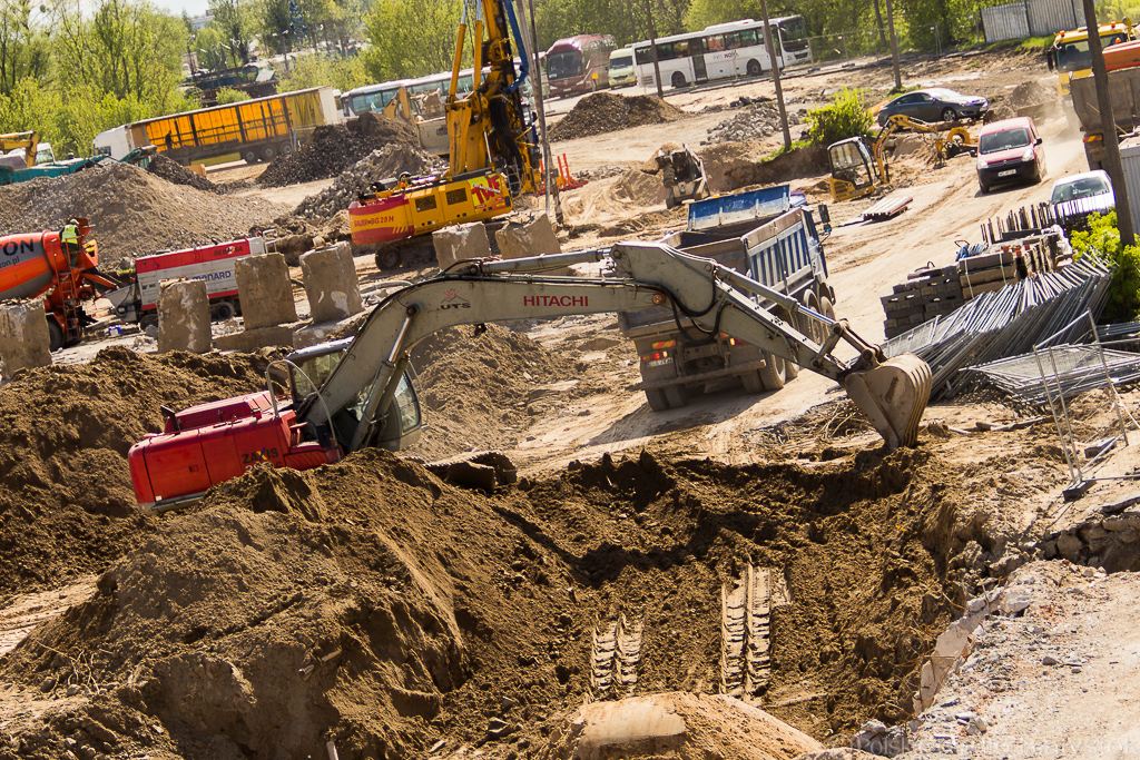 Koparki pracowicie wydobywają ziemię i przesypują do ciężarówek, które przewożą ją w inne miejsce budowy. Walce w powolnym tempie, ale dokładnie, ubijają piach. Gruszki betoniarek kręcą się wokół własnej osi przygotowując beton do wylania.