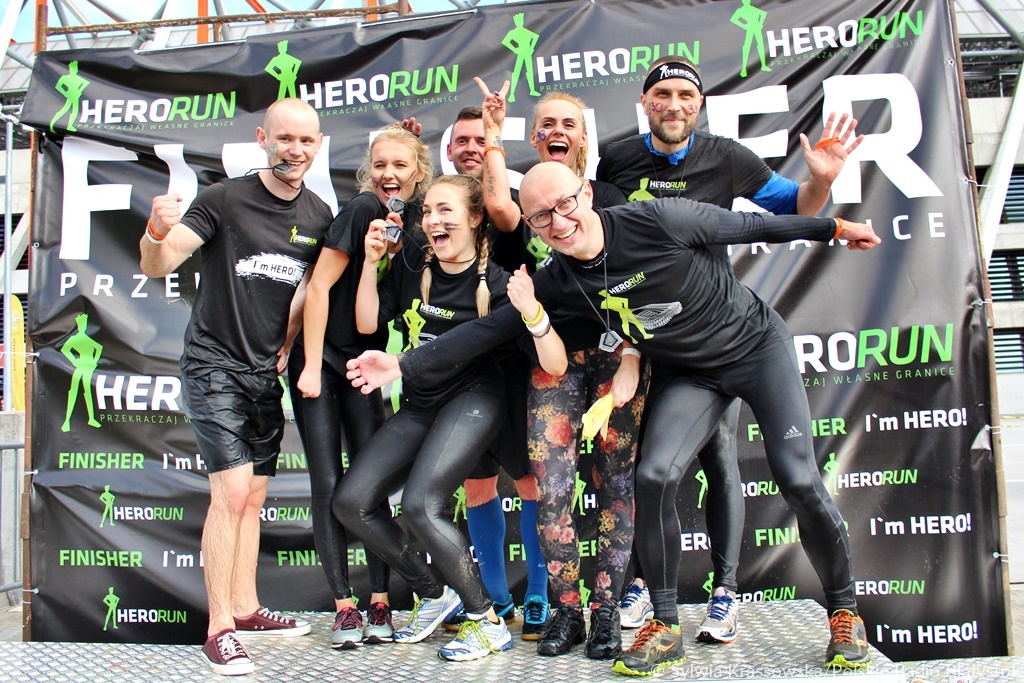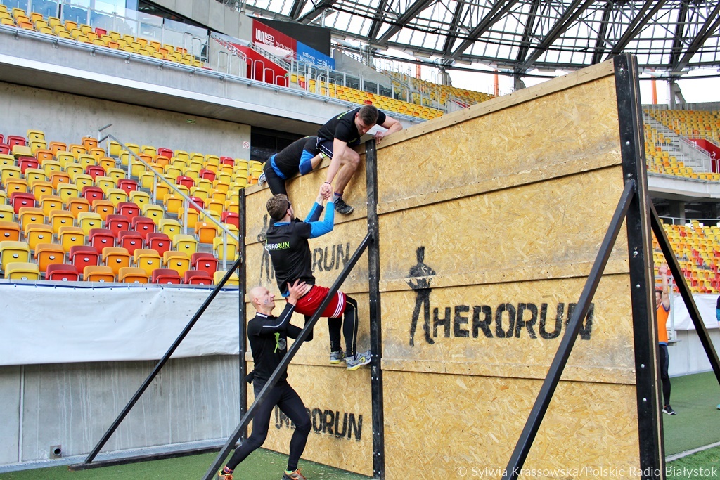 Uczestnicy Hero Run, oprócz 4 km biegu, mieli do pokonania 20 przeszkód poustawianych na stadionie i wokół obiektu. Setki schodków w górę i w dół, czasem z oponami na plecach, skoki, czołganie i wspinanie, strzelanie z łuku, rzuty piłką lekarską, nie mogło, oczywiście zabraknąć rowów z wodą.