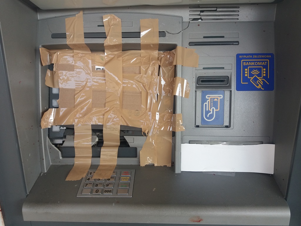 Wezwani na miejsce policjanci zauważyli, że uszkodzony jest wmontowany w ścianę bankomat. Sprawcy uszkodzili elektronikę i obudowę urządzenia. Nie udało się im jednak ukraść z niego pieniędzy.