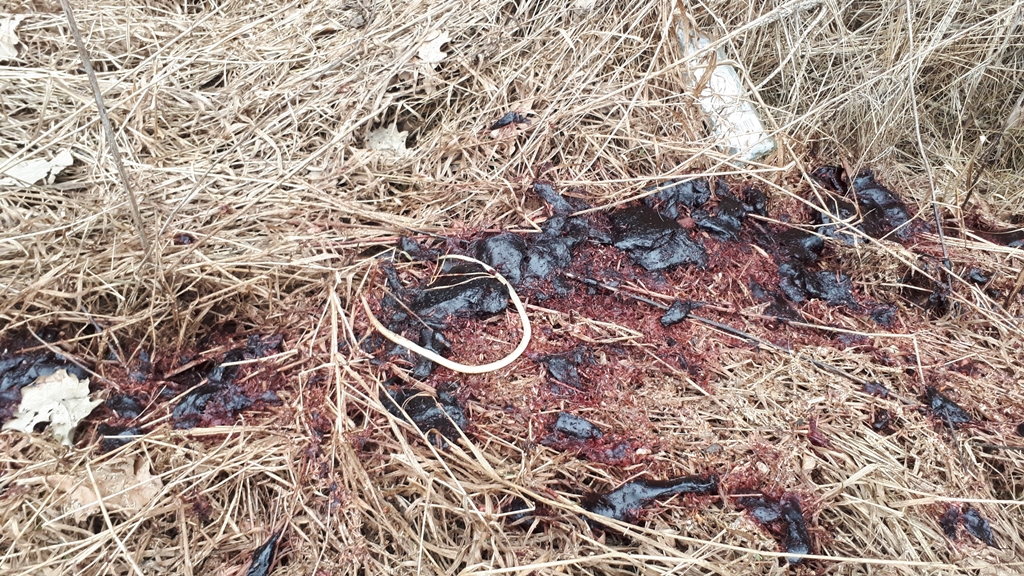 Makabryczne znalezisko zauważono we wtorek (13.03) rano wzdłuż powiatowej drogi w Olmontach pod Białymstokiem. Wygląda to tak, jakby zanieczyszczenia wylano z cysterny lub innego dużego zbiornika.