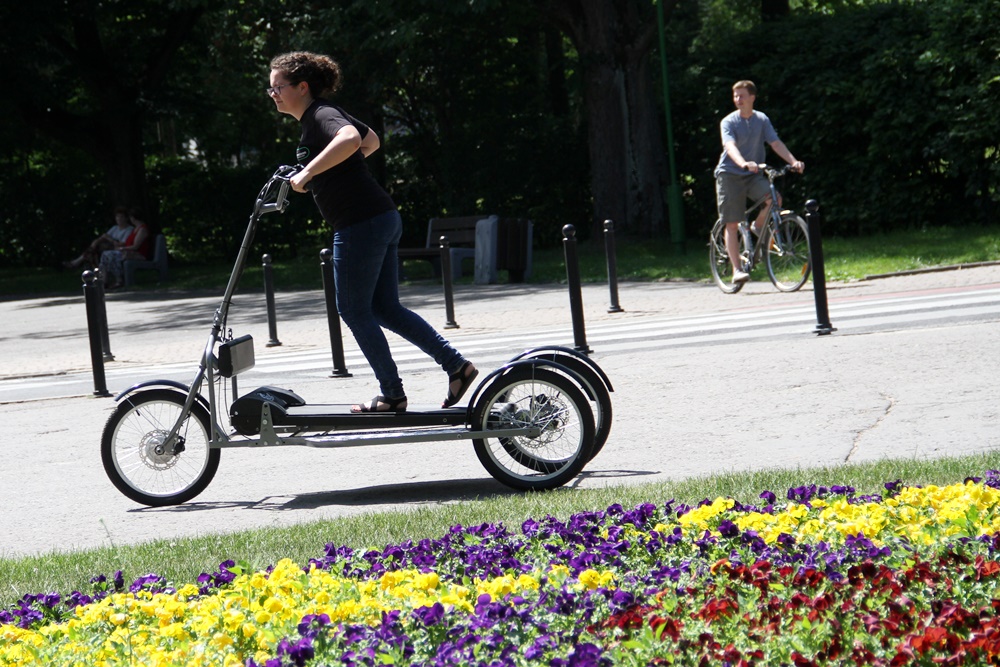 Prototyp biegoroweru zaprezentowano na konferencji prasowej. To trzykołowe urządzenie, które łączy w sobie cechy roweru miejskiego i bieżni. Ma napęd hybrydowy.