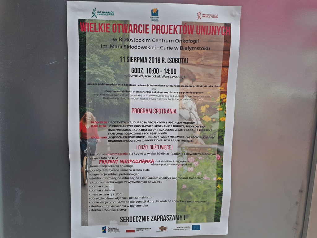 Badania mammograficzne, nauka samobadania piersi w ramach profilaktyki raka, ale też rehabilitacja i pomoc w powrocie na rynek pracy osobom po chorobie nowotworowej - to główne elementy dwóch programów, które zainaugurowało w sobotę (11.08) Białostockie Centrum Onkologii.