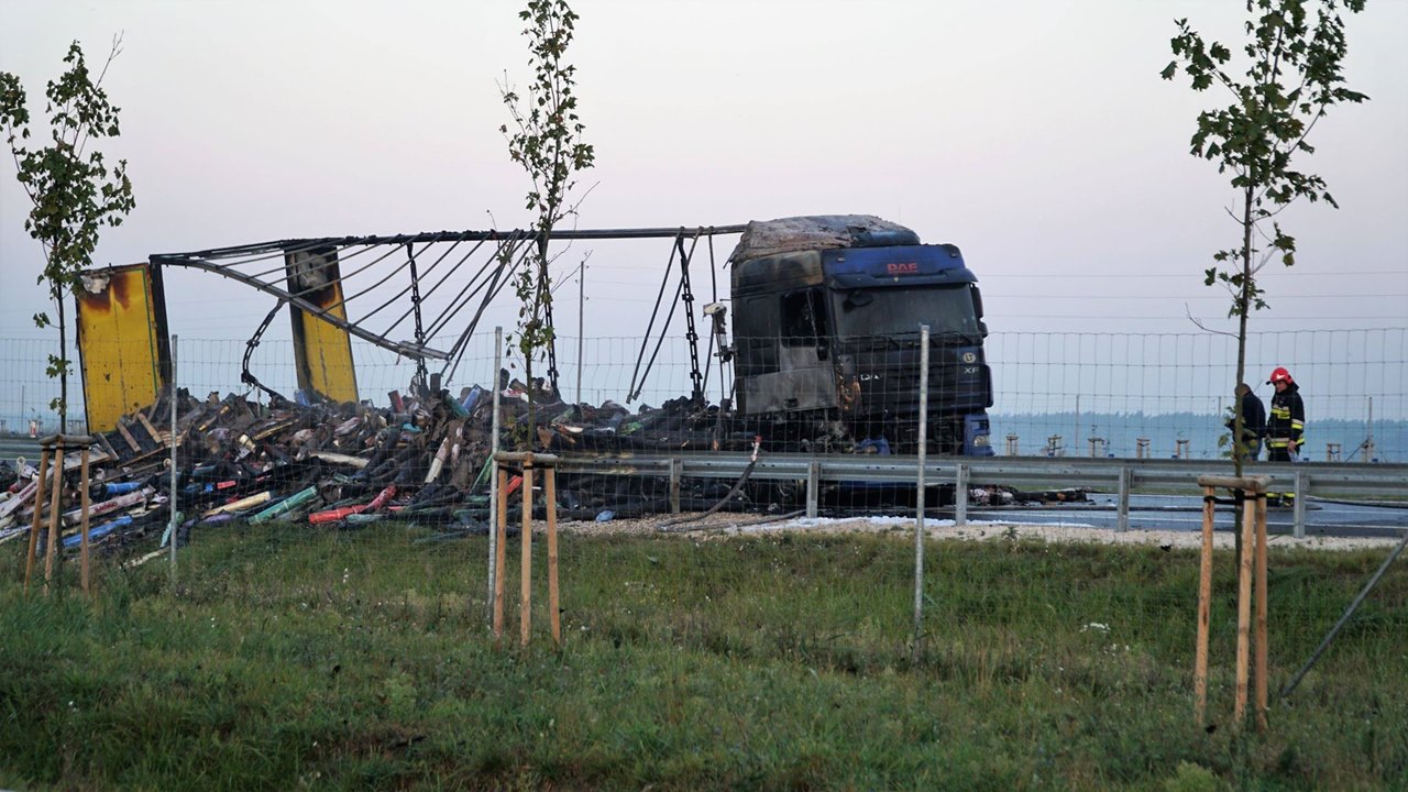Przed 4:00 rano straż pożarna dostała informację o palącej się tam ciężarówce z ładunkiem folii rolniczej w belach. Tir i ładunek spłonął, w miejscu pożaru została także uszkodzona infrastruktura drogi - poinformował kpt. Mariusz Wąsewicz z Wojewódzkiego Stanowiska Koordynacji Ratownictwa Państwowej Straży Pożarnej w Białymstoku. Policja podaje, że nie ma ofiar tego zdarzenia.