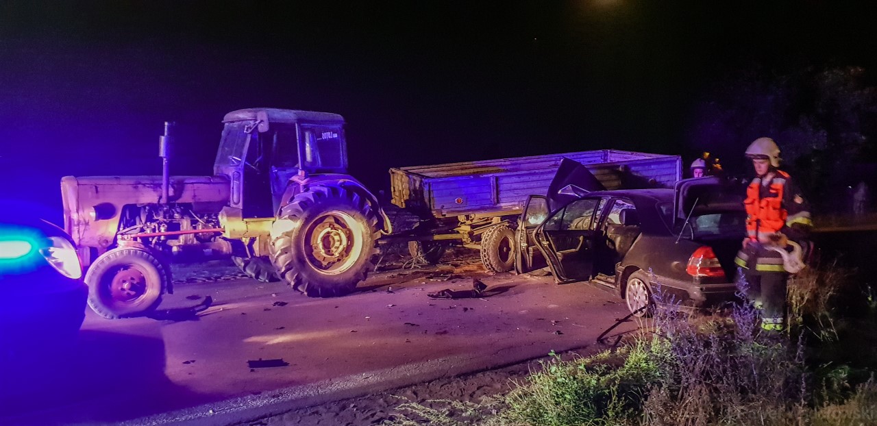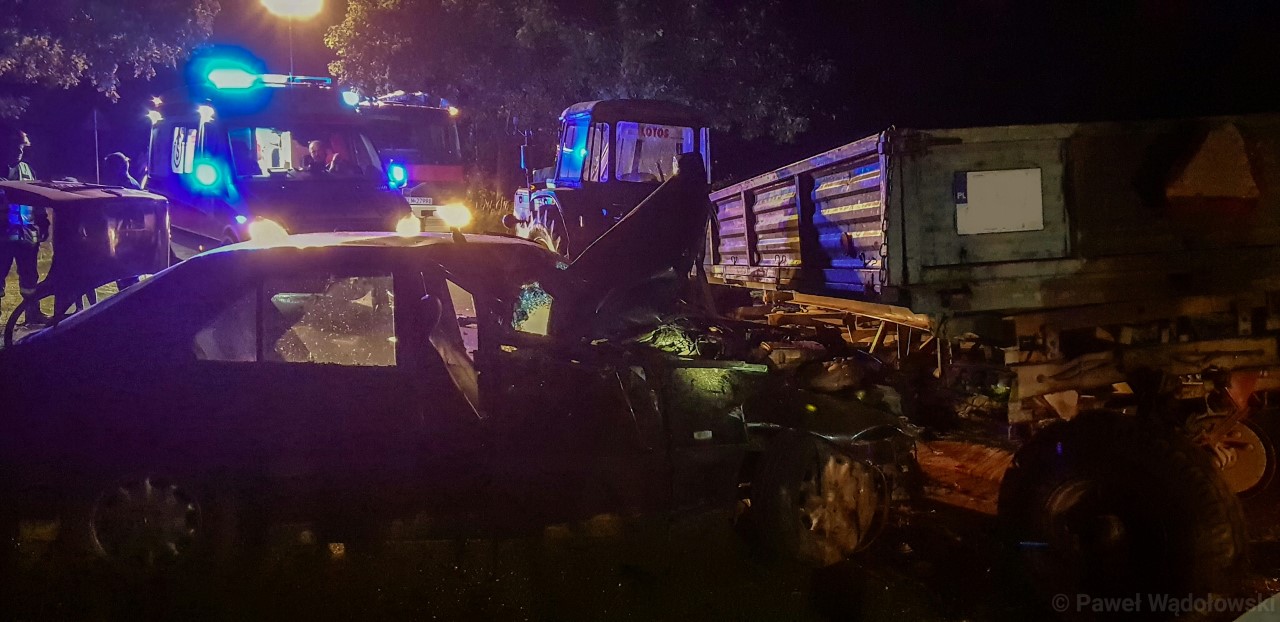 Doszło do zderzenia samochodu osobowego z naczepą pojazdu rolniczego. Jak wynika ze wstępnych ustaleń samochód uderzył w jadący w tym samym kierunku ciągnik z naczepą. Policjanci wyjaśniają okoliczności wypadku. Sprawdzają min czy naczepa była odpowiednio oświetlona.
