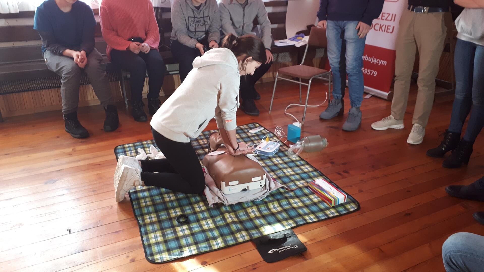 W sobotnim kursie wzięła udział młodzież z pobliskiego gimnazjum. Na specjalnych fantomach młodzi ludzie uczyli się m.in., jak działają defibrylatory, jak ocenić stan poszkodowanego, jak robić masaż serca, na co zwrócić uwagę, a czego robić nie wolno.