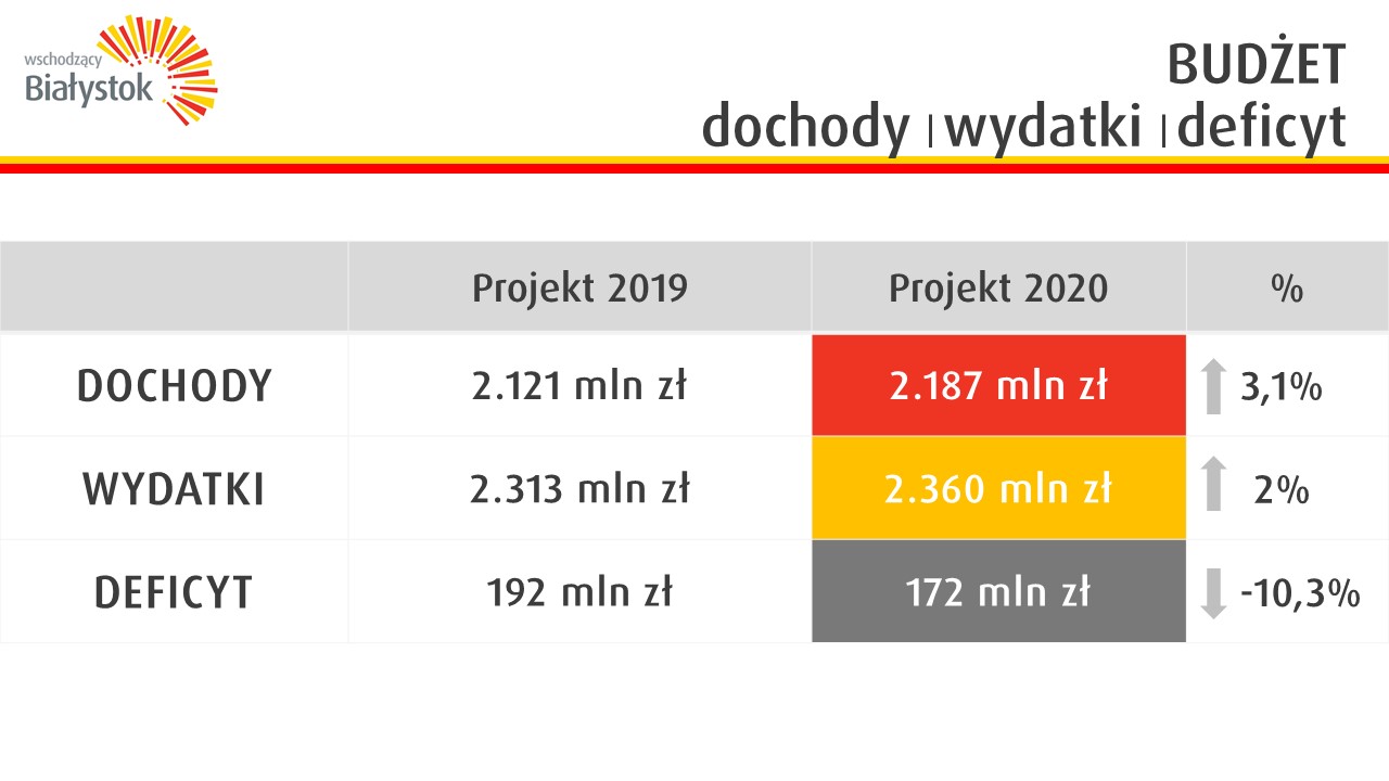Dochody mają wynieść ponad 2,18 mld zł (wzrost o 3,1 proc), wydatki ponad 2,36 mld zł (wzrost o 2 proc.), planowany deficyt to 172 mln zł i ma być o 10 proc. mniejszy niż w 2019 r. Wskaźnik zadłużenia miasta zwiększy się o 3,4 proc. z 46,8 proc. do 50,2 proc., co oznacza spełnienie wymogów ustawowych.