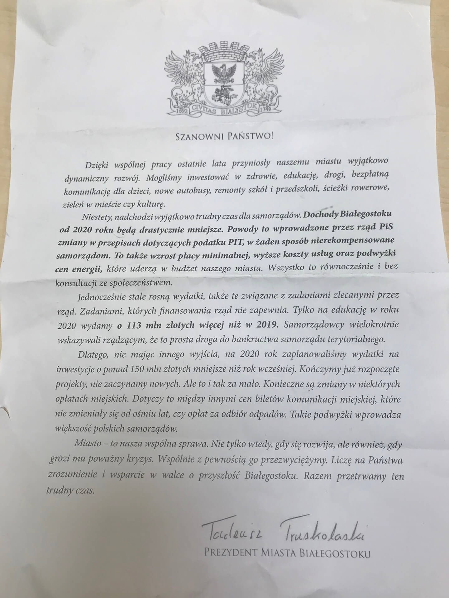 Do 150 tysięcy białostoczan trafi list od prezydenta miasta. Tadeusz Truskolaski krytykuje w nim rząd i wskazuje m.in. powody wzrostu cen biletów komunikacji miejskiej.