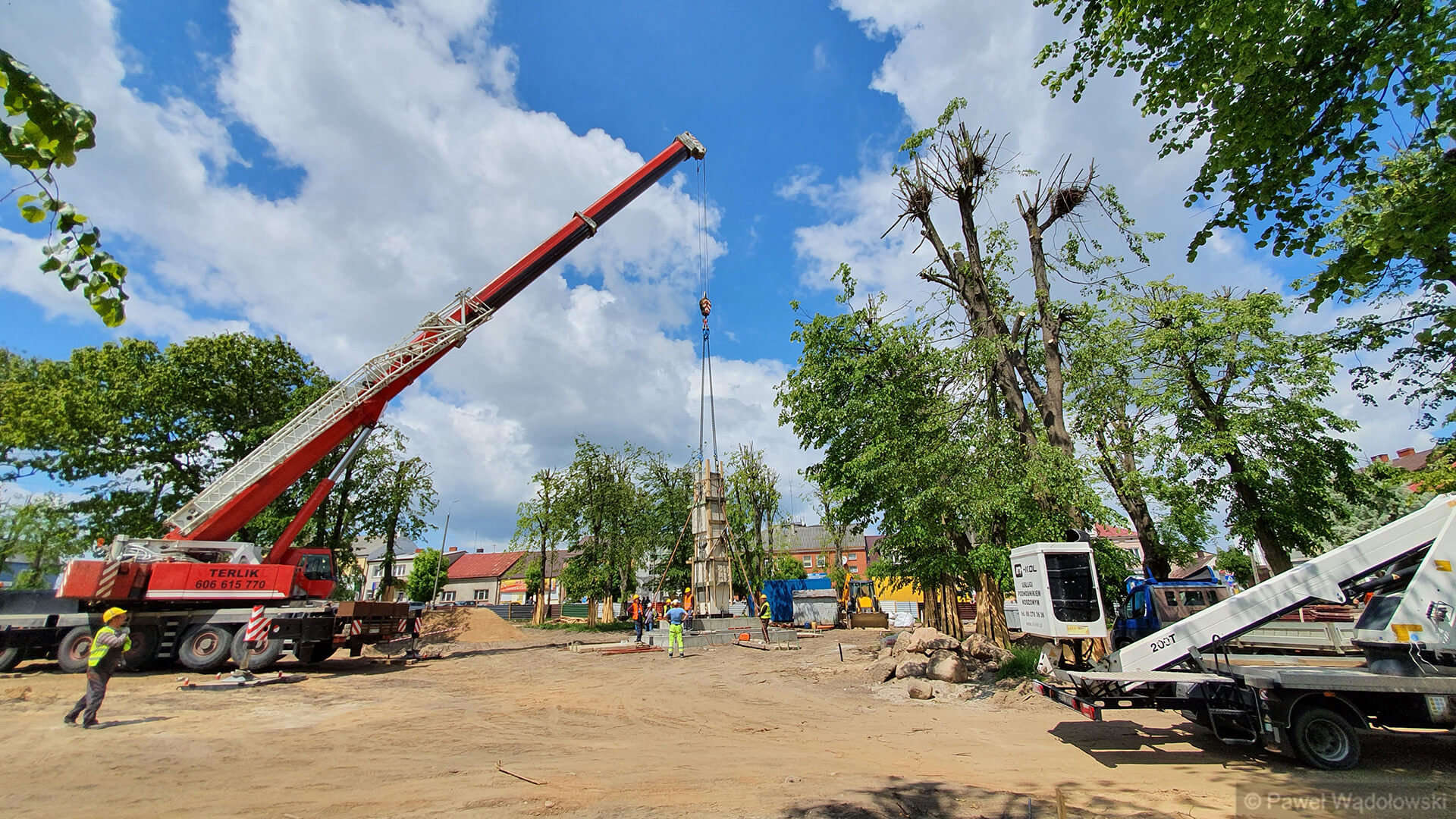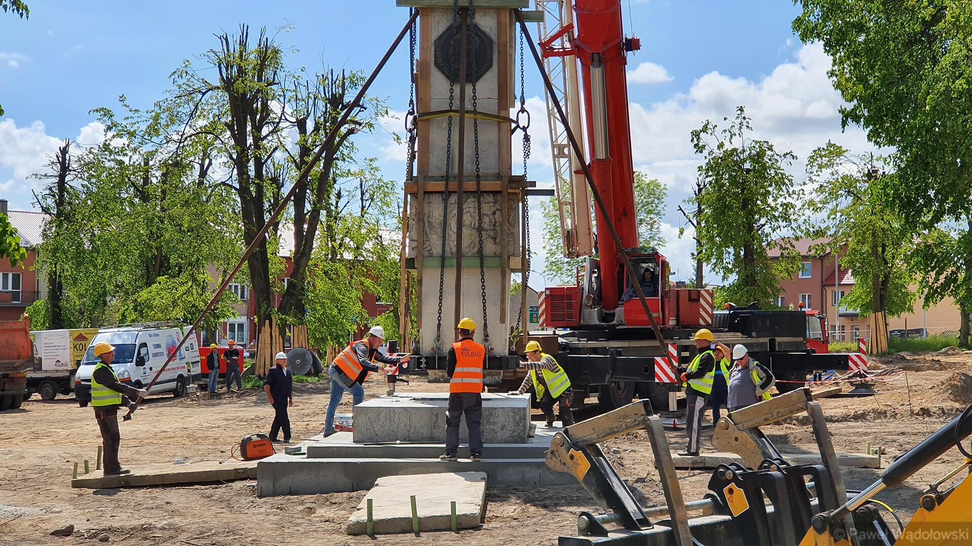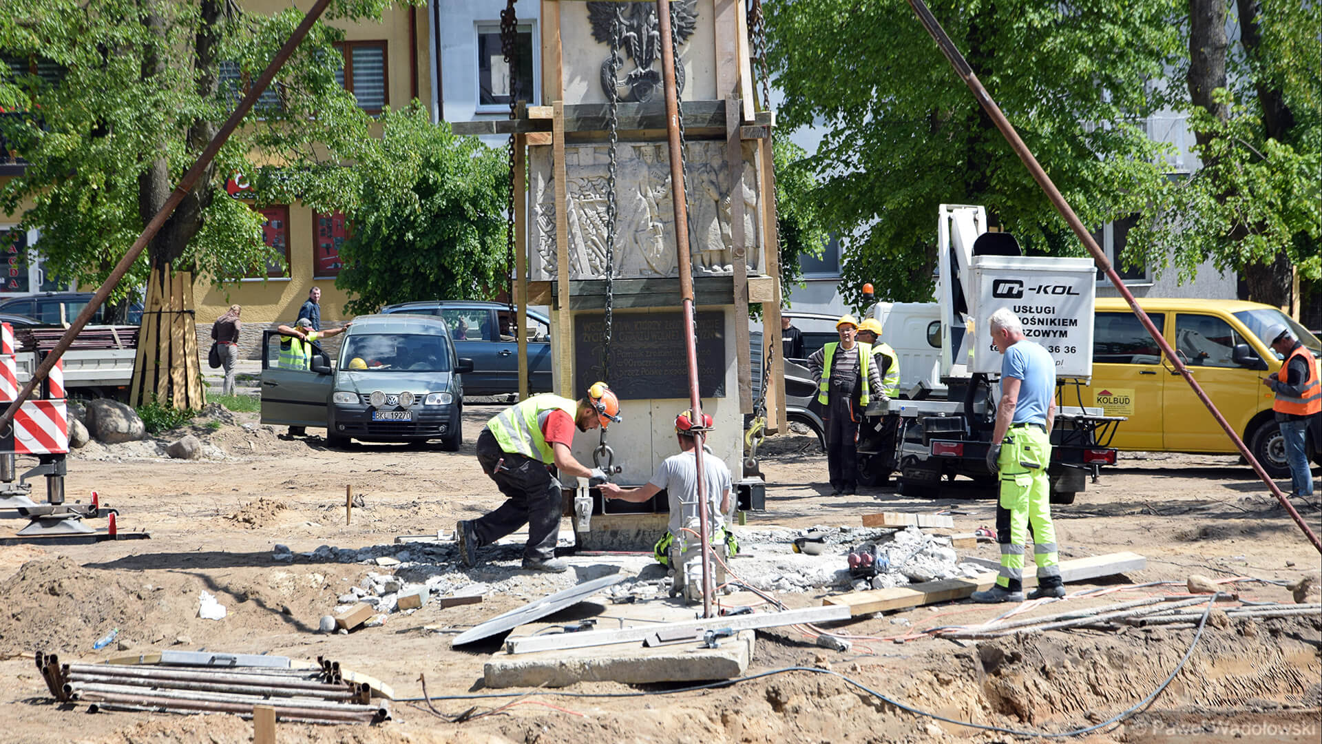 - Nie wiemy jak się ten pomnik zachowa podczas transportu. Mamy dźwig, który może podnieść 160 ton i piłę do przecięcia pomnika. Lekko napinamy liny i podcinamy cokół. A potem przenosimy w nowe miejsce. Pomnik waży 20 ton i jest z piaskowca. Zrobiliśmy specjalne zabezpieczenia, żeby się nie rozleciał - mówi Waldemar Skrodzki z firmy, która przebudowuje kolneński park.