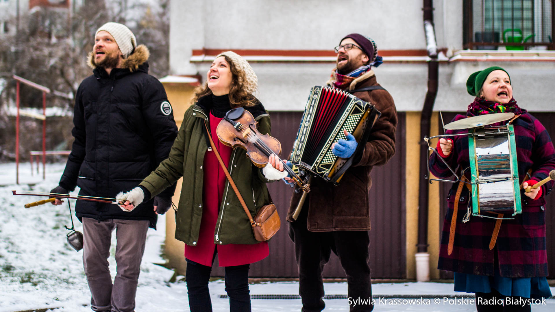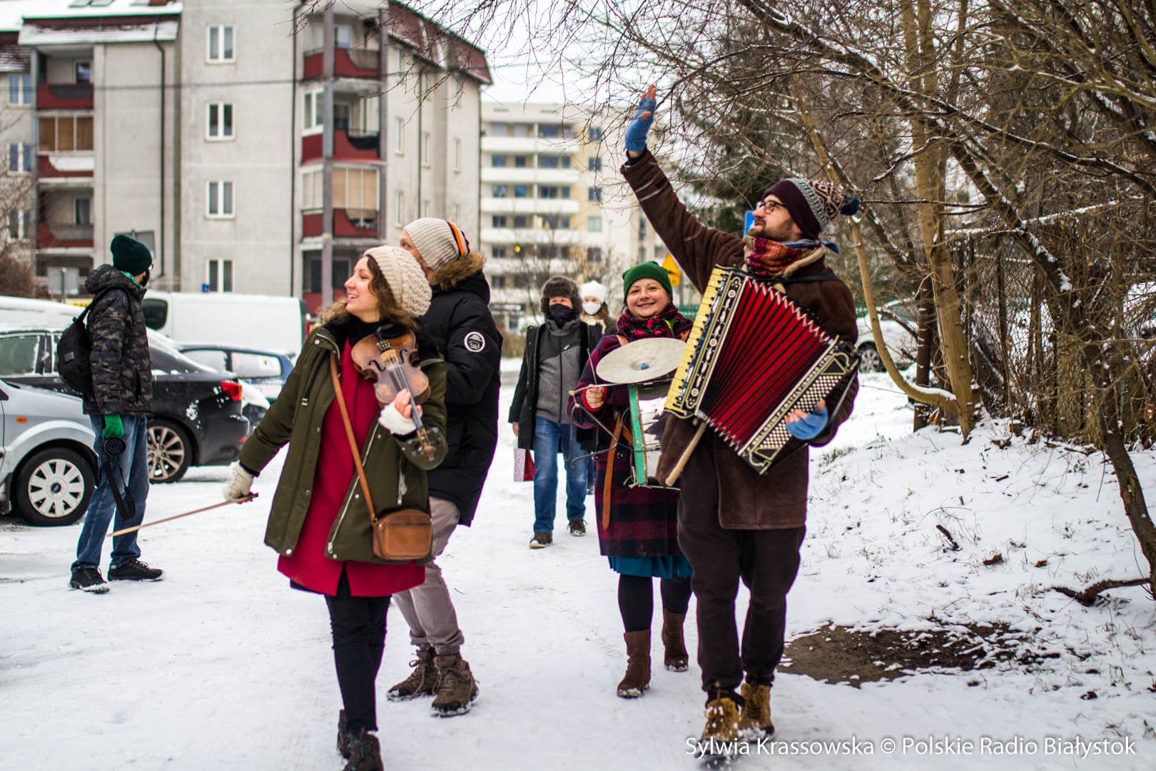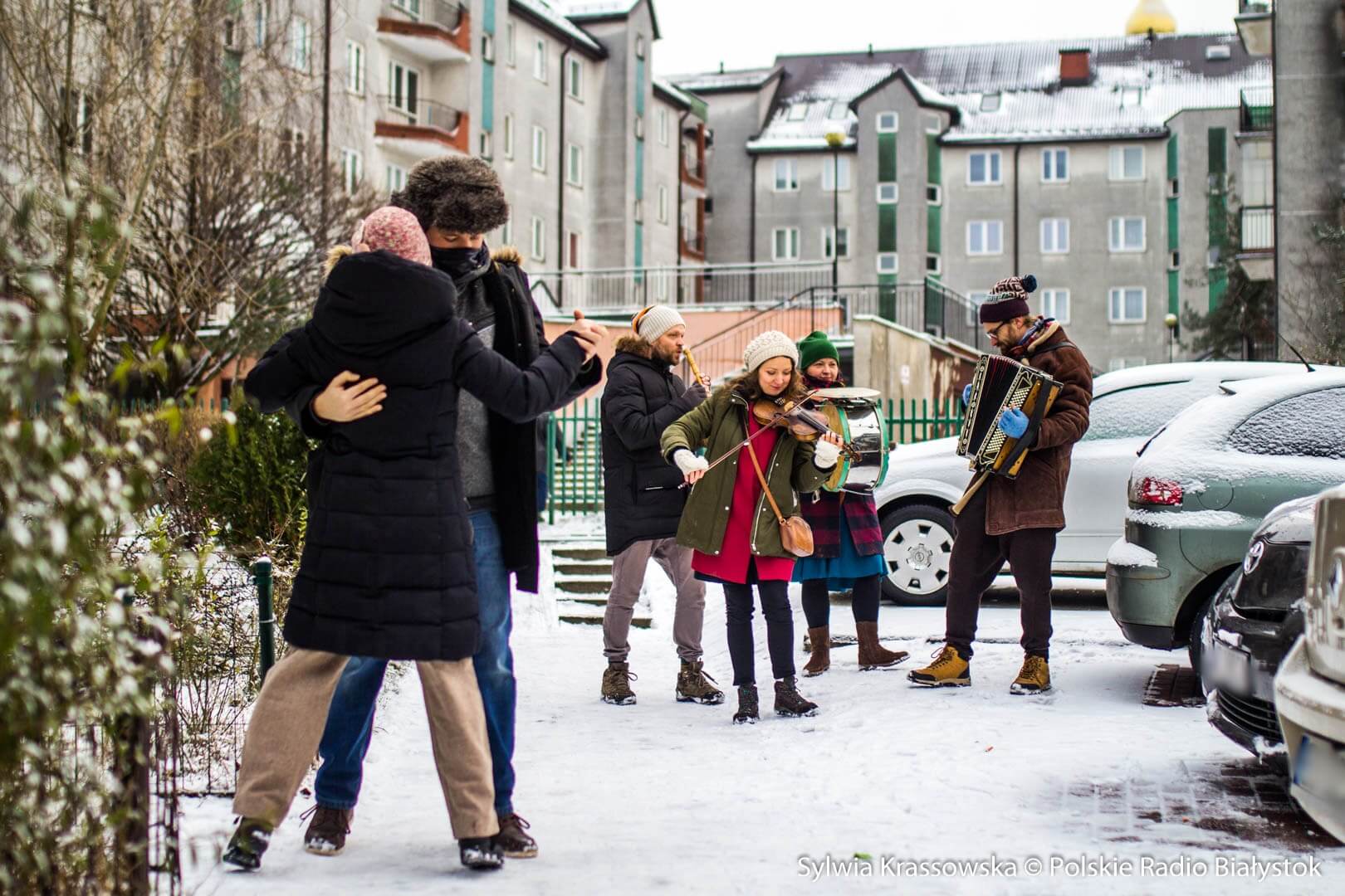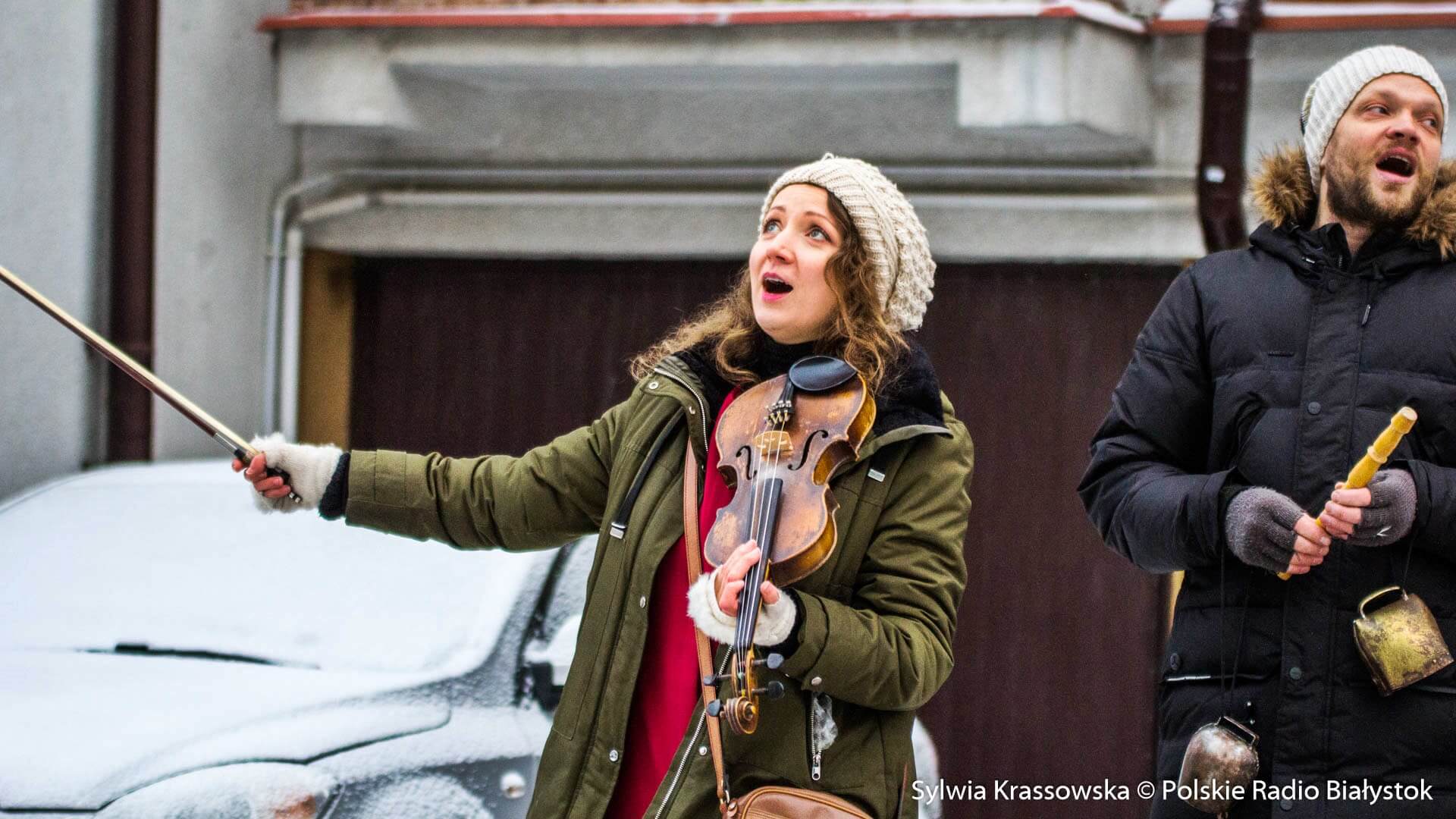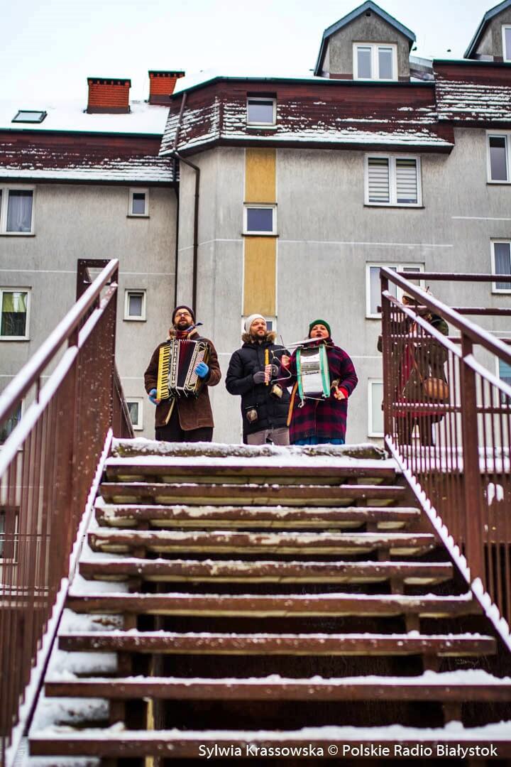 W zimowej, śnieżnej scenerii w niedzielę (13.12) Kapela Batareja muzykowała świątecznie pod balkonami mieszkańców białostockich osiedli: Nowe Miasto i Piaski.