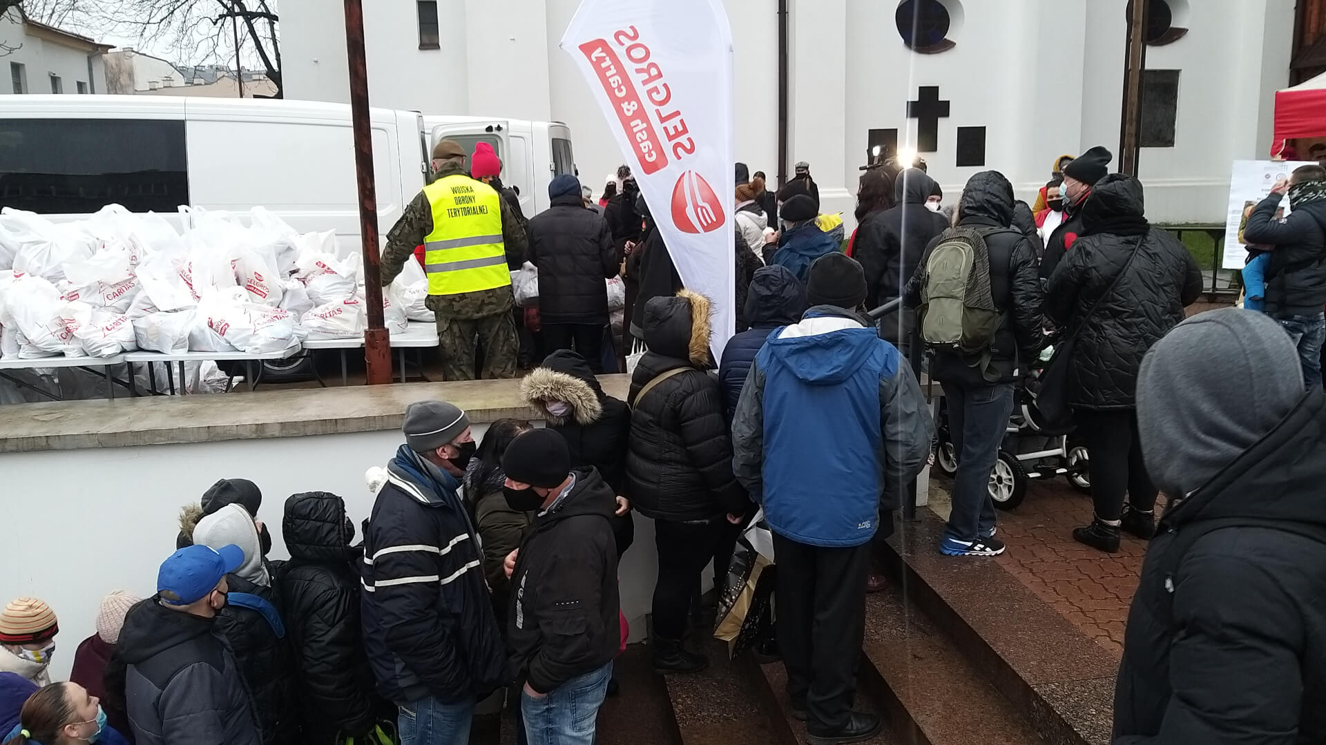 W czwartek (24.12) przy katedrze wolontariusze i żołnierze WOT rozdawali paczki ze świątecznymi potrawami. Znalazły się w nich m.in. gotowe dania wigilijne, słodycze i środki czystości.