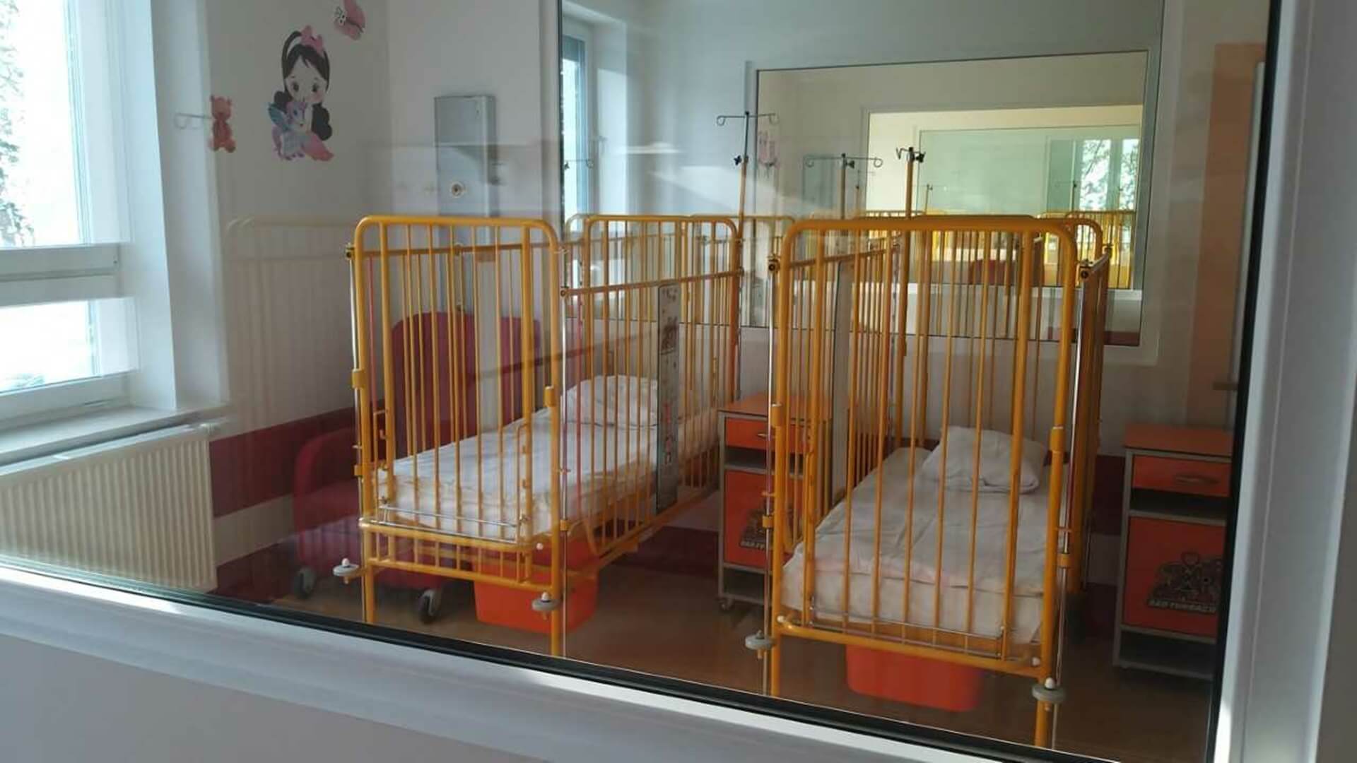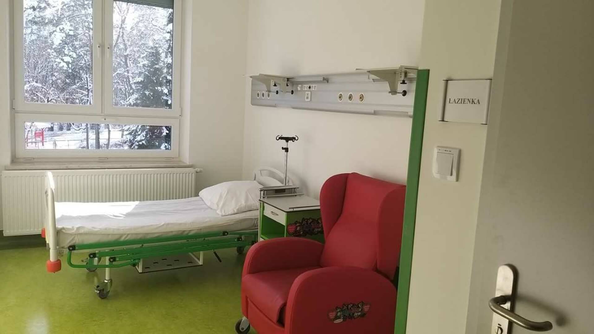 W pokojach najmłodszych dzieci oprócz łóżeczek, przewijaków i wanienek znajdują się rozkładane fotele dla rodziców i opiekunów. Szpital bezpłatnie udostępnia pościel.