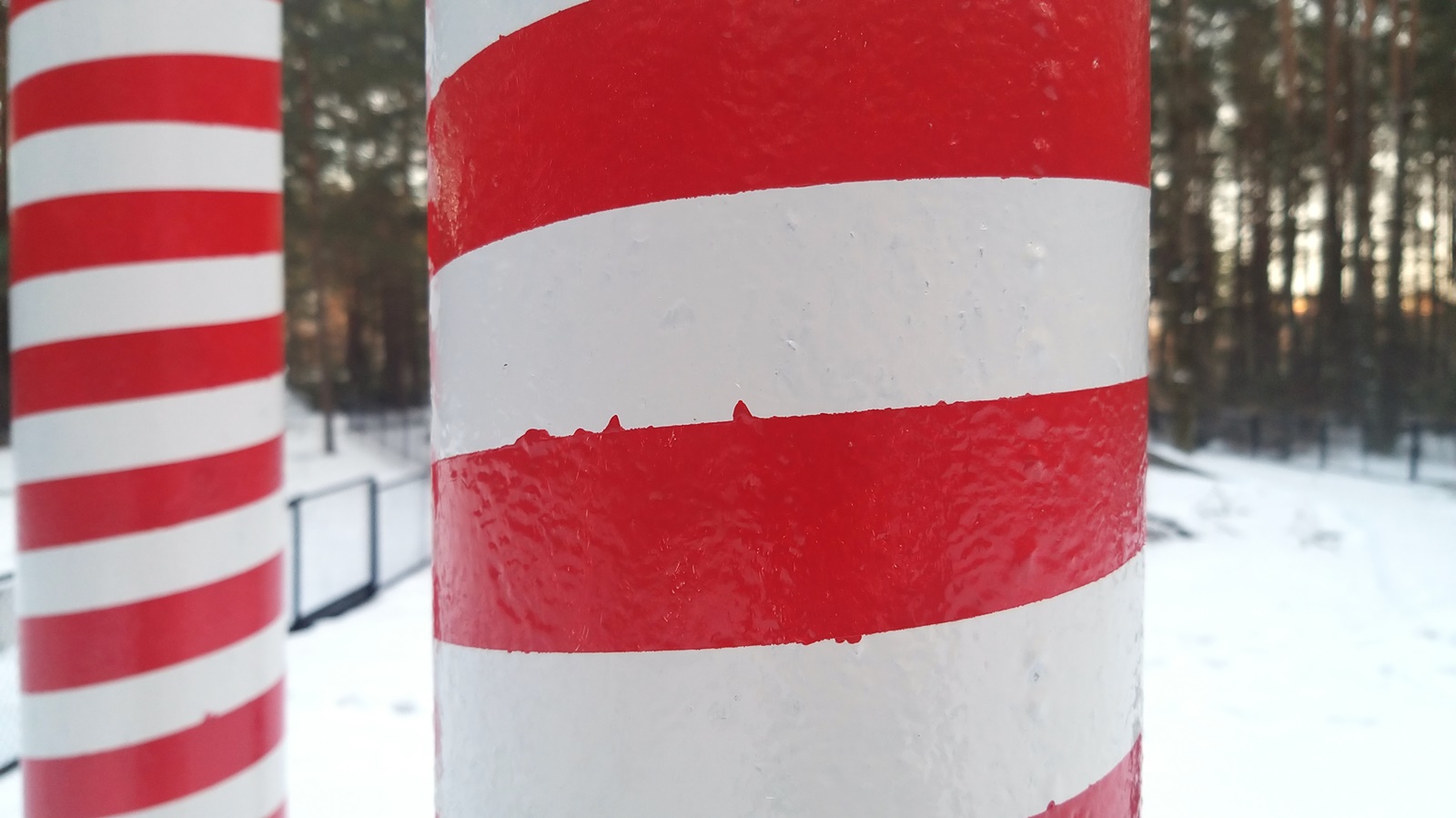 Maszty są pomalowane w biało-czerwone, ukośne i wąskie, zaledwie kilkucentymetrowe paski. Zdjęcie w Internecie udostępnił białostoczanin, miłośnik regionalnej historii Andrzej Bieluczyk. Jak mówi, kontrowersje wzbudza efekt prac, bo paski nie są równe i namalowane są pod różnym kątem.