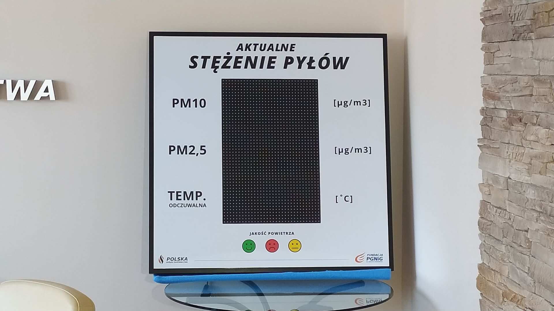 Tablica wyświetla pyły zawieszone PM10 i PM2,5 oraz temperaturę odczuwalną. Takie urządzenie jest wyposażone w specjalny czujnik, który jest umieszczony na zewnątrz, ale dodatkowo w tej edycji dajemy czujnik, który można umieścić wewnątrz budynku i wtedy możemy to monitorować, również poprzez stronę internetową