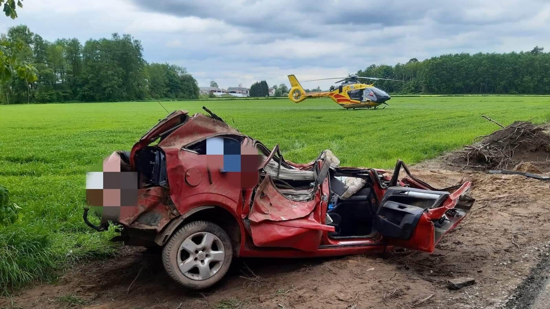 Samochód wpadł do rowu, następnie dachował. Rannego mężczyznę do szpitala zabrał śmigłowiec Lotniczego Pogotowia Ratunkowego. Droga w miejscu wypadku jest zablokowana.