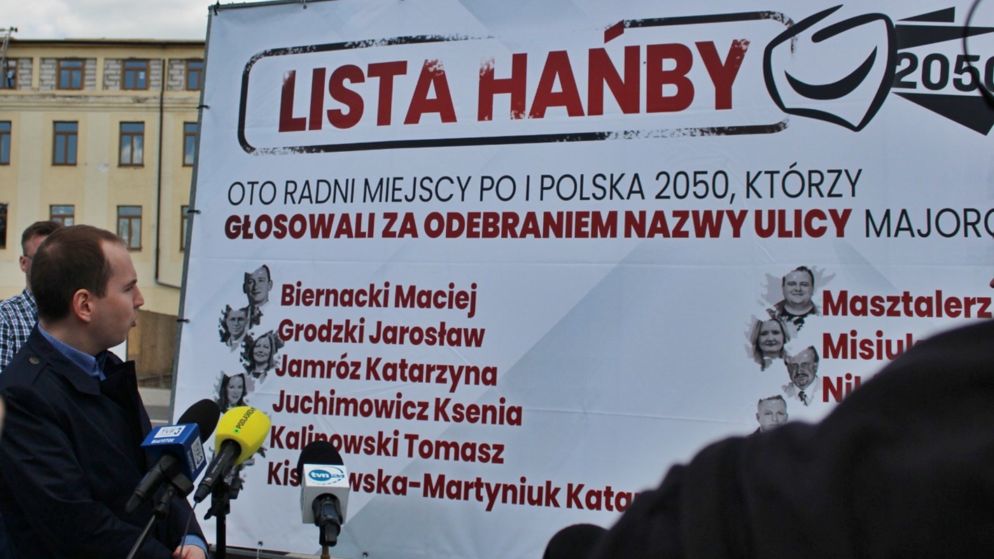 W poniedziałek (31.05) w centrum Białegostoku stowarzyszenie "Dla Polski - Ruch Adama Andruszkiewicza" zaprezentowało mediom baner zatytułowany "lista hańby", z nazwiskami i wizerunkami tych radnych Koalicji Obywatelskiej i Ruchu Polska 2050, którzy głosowali za projektem uchwały o zmianie nazwy ulicy na Podlaską.