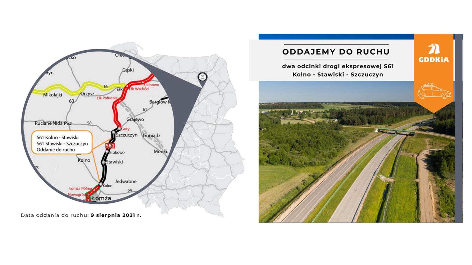 Oddano tam do ruchu odcinki - od węzła Kolno do Stawisk oraz od Stawisk do Szczuczyna - o łącznej długości prawie 35 km. To kolejny fragment międzynarodowego korytarza transportowego via Baltica (po odcinku Śniadowo - Łomża Południe) przekazany w tym roku do użytku. Jak podała GDDKiA, wraz z - ukończoną w ubiegłym roku - drugą jezdnią obwodnicy Szczuczyna oraz fragmentem obwodnicy Stawisk, odcinki te dają ok. 44-kilometrowy fragment S61 w województwie podlaskim.