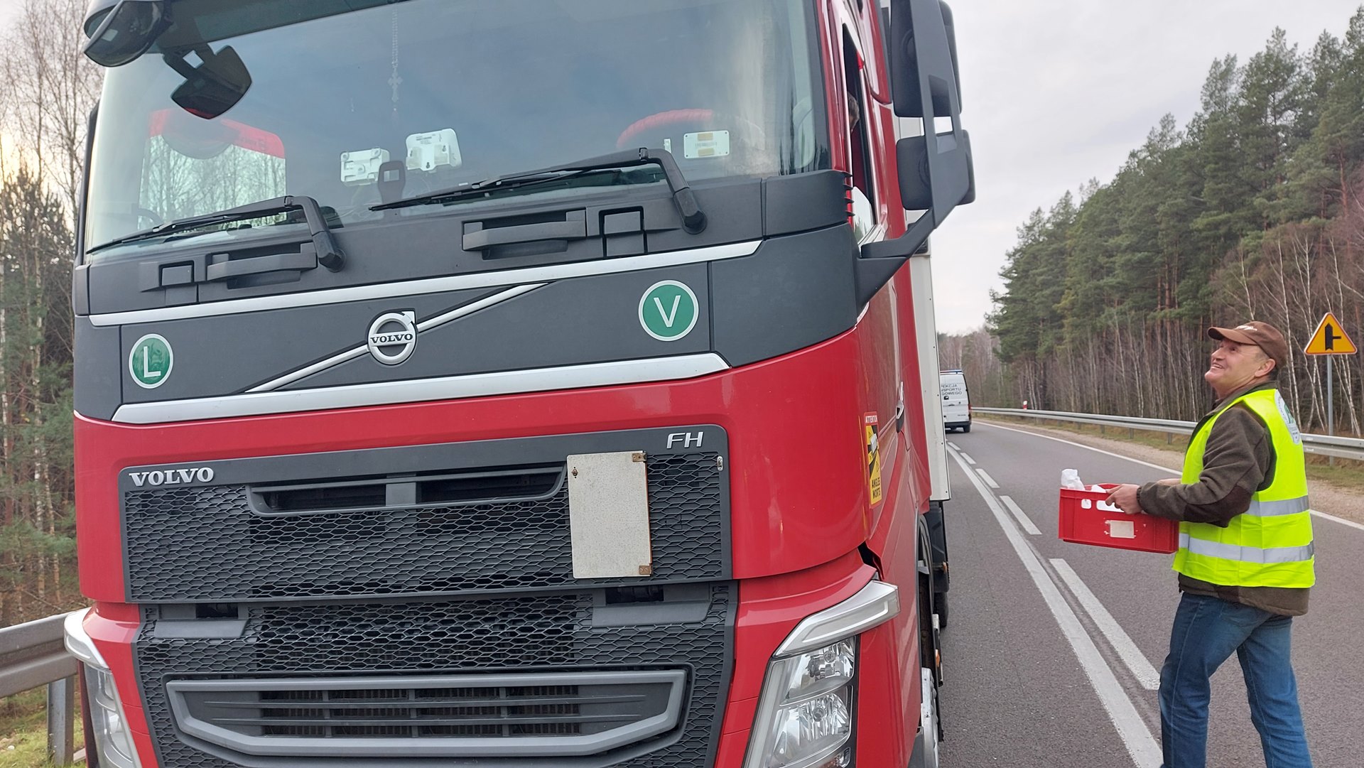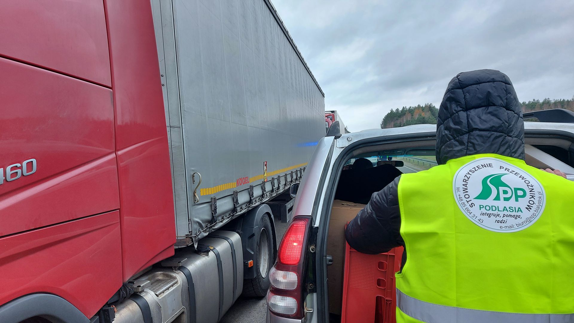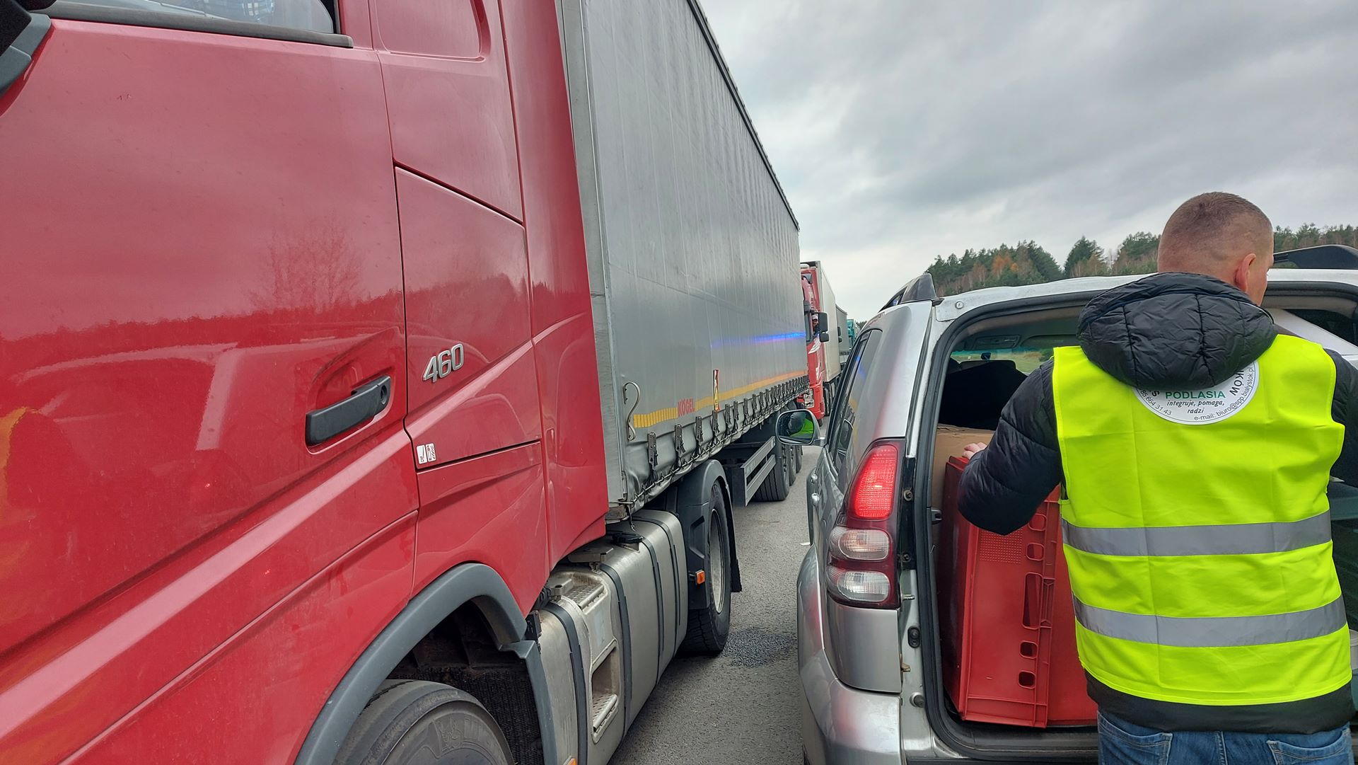 Kierowcy ciężarówek, którzy stoją przed przejściem w Bobrownikach, dostali jedzenie od Stowarzyszenia Przewoźników Podlasia.