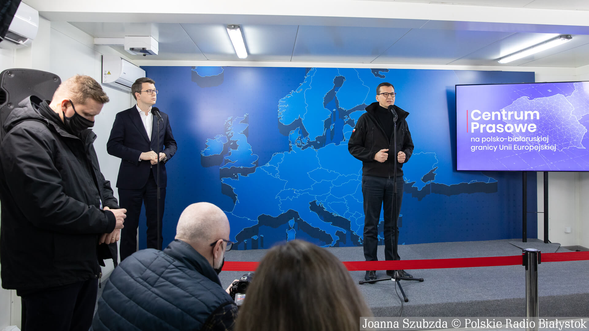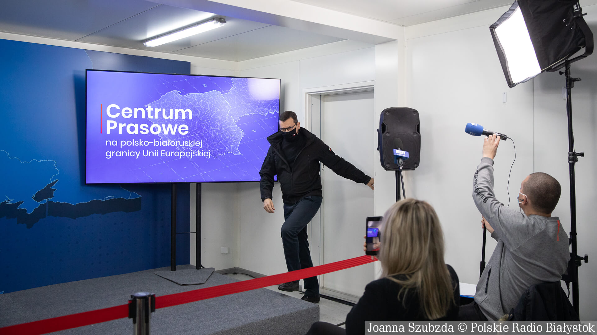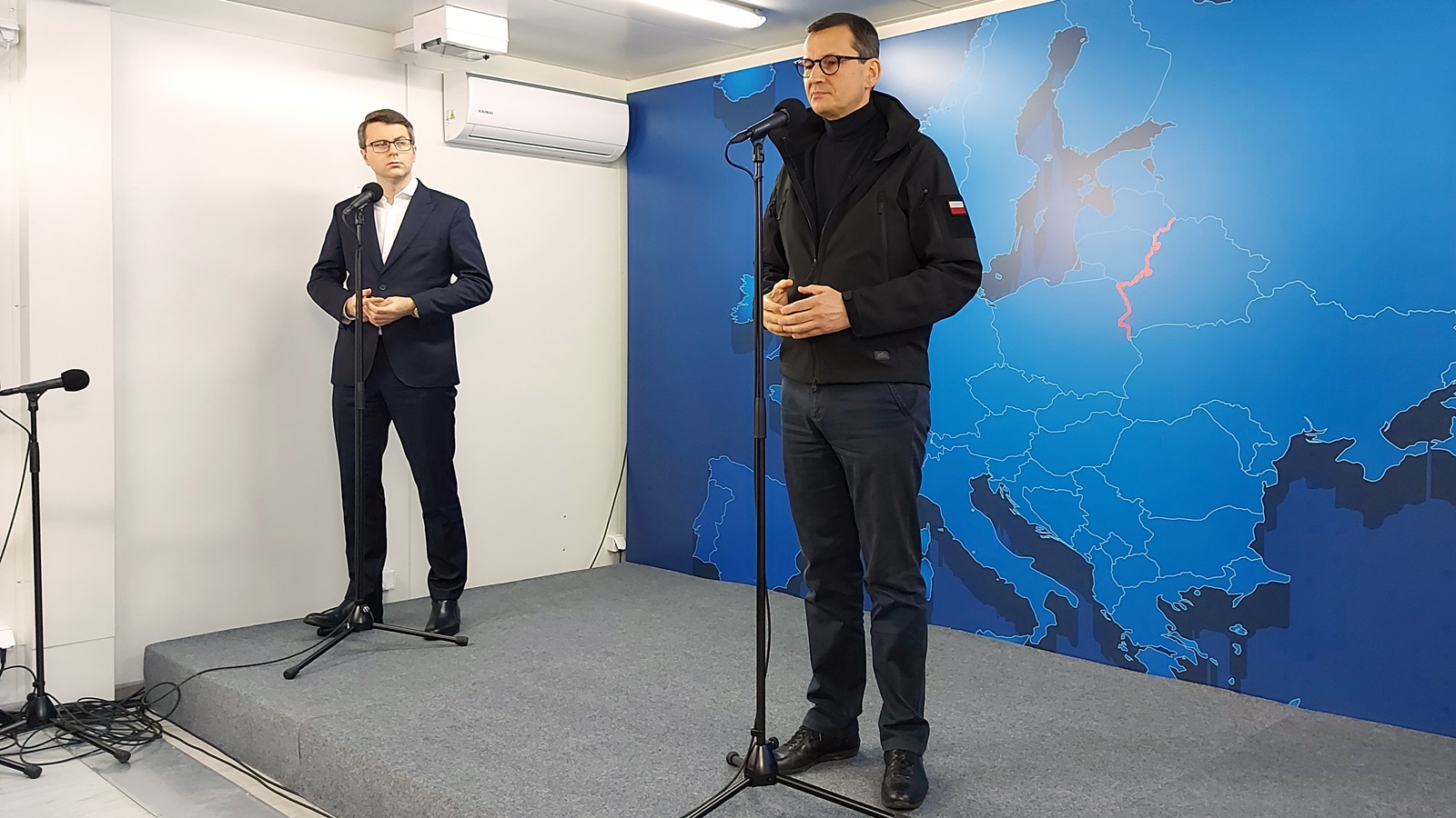 Na konferencji prasowej w Popławcach premier wskazał, że granica polsko-białoruska oddziela dyktaturę od demokracji.