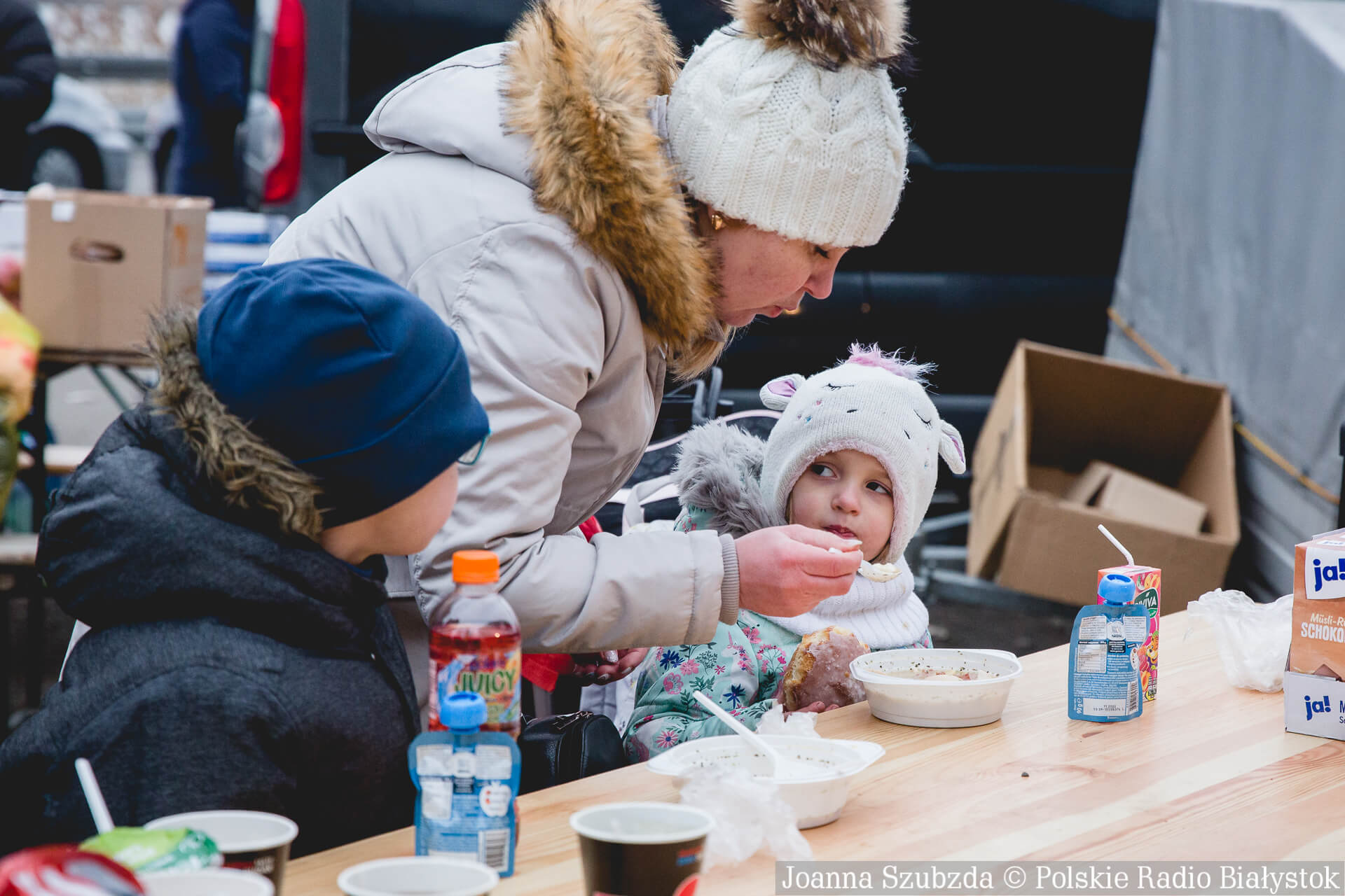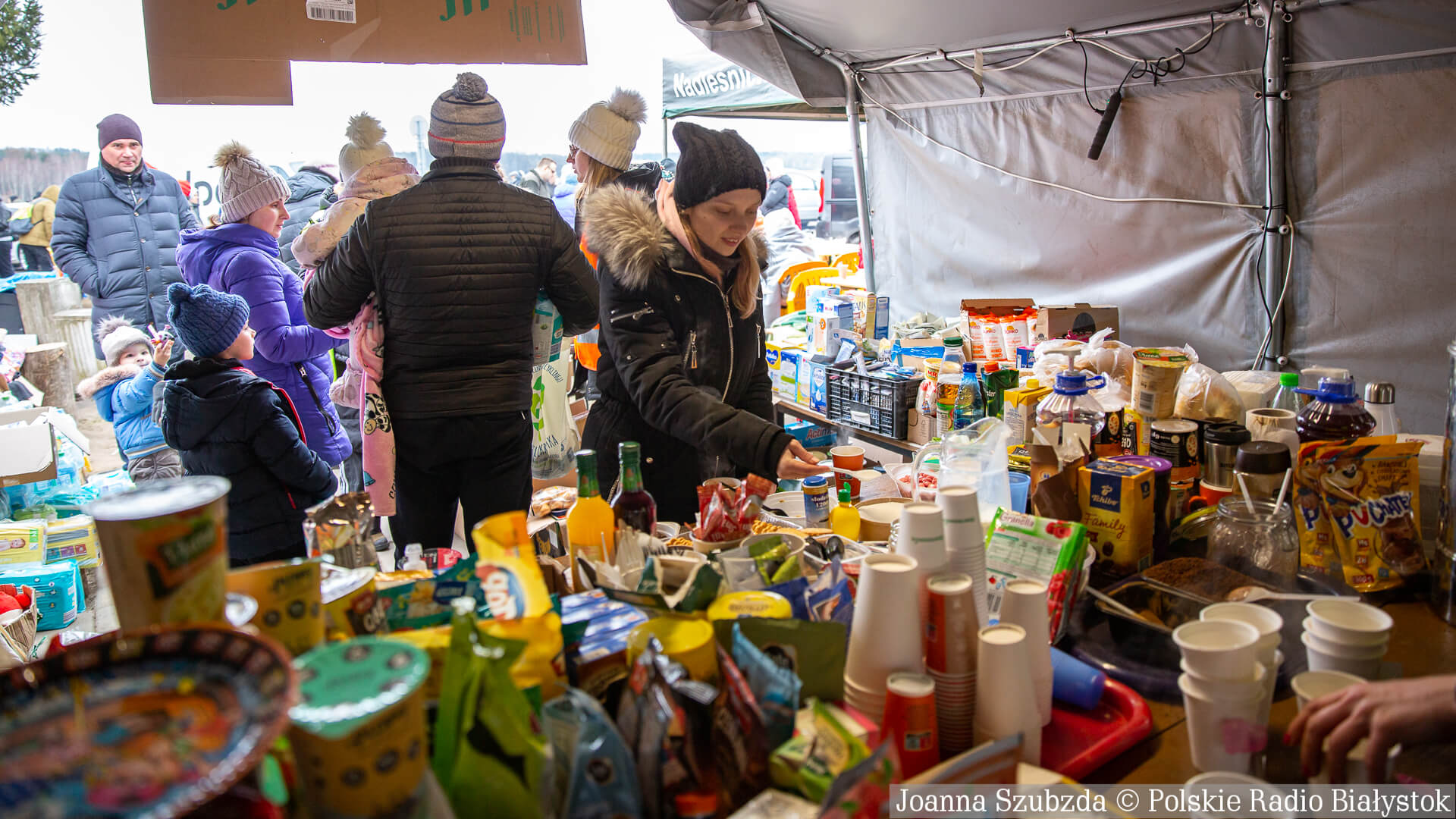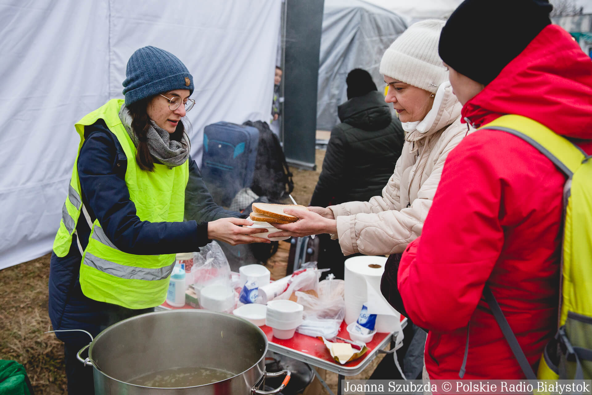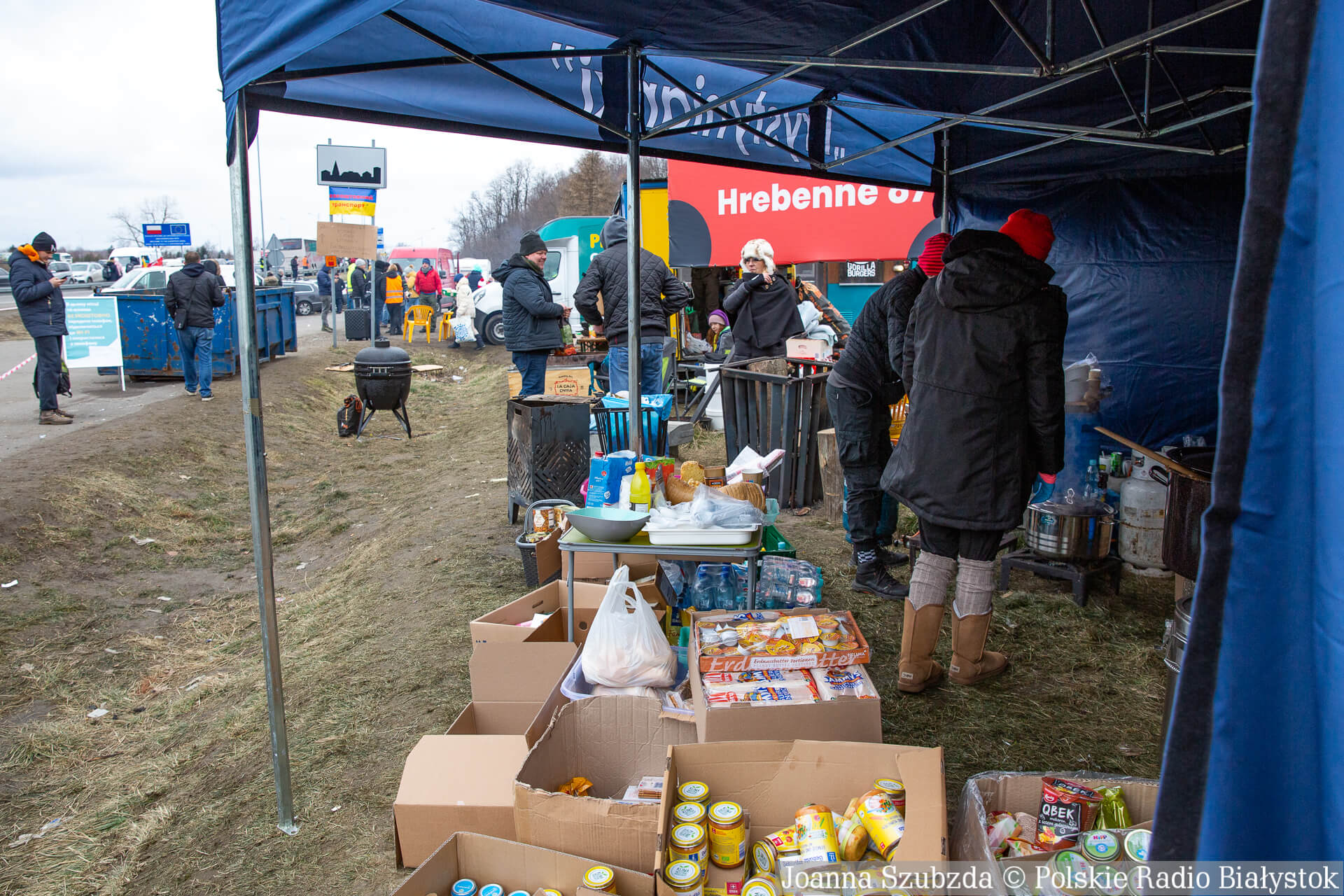 Każdy z wjeżdżających do naszego kraju na miejscu dostaje ciepły posiłek, kawę, herbatę, a najmłodsi słodycze i maskotki. Na przejściu w Hrebennem jest dużo wolontariuszy. Są to osoby z Polski, ale spotkaliśmy także osoby m.in. z Niemiec czy Włoch.