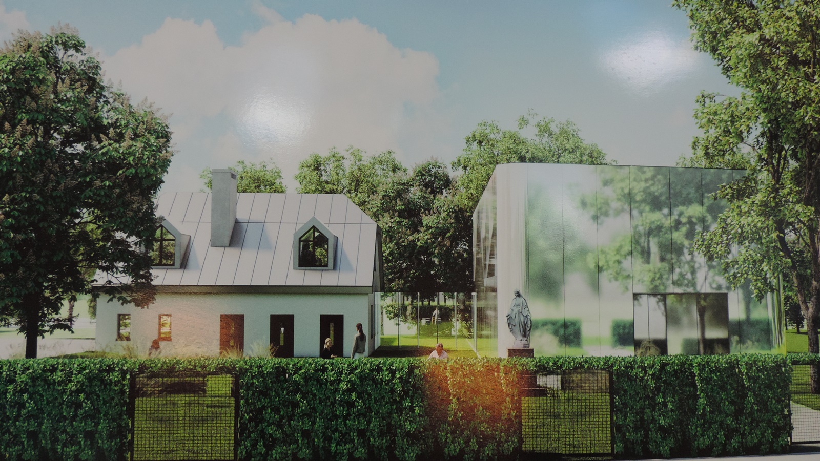 Nowy obiekt ma nowoczesny kształt, ale plany przewidują obłożenie jego elewacji lustrzanymi płytami, będzie więc czymś na kształt dworskiej oranżerii i doskonale koresponduje zarówno z zabytkowym dworem, jak i położonym między nimi ośrodkiem edukacji przyrodniczej.