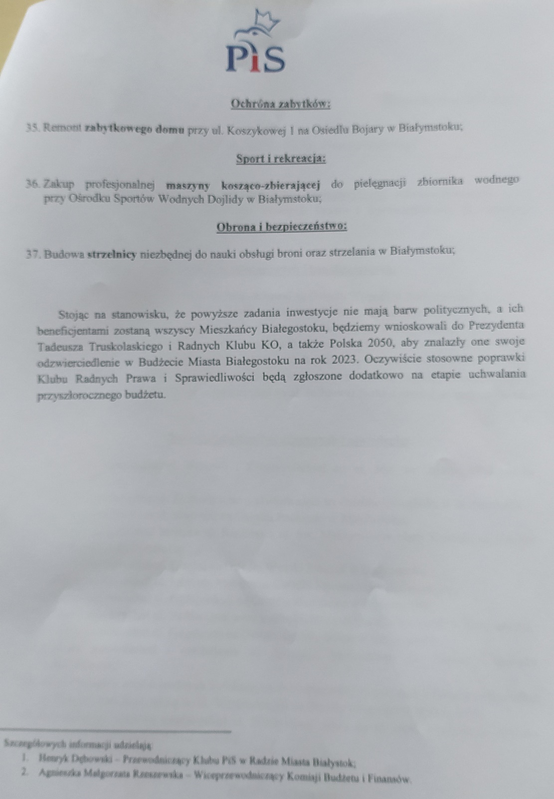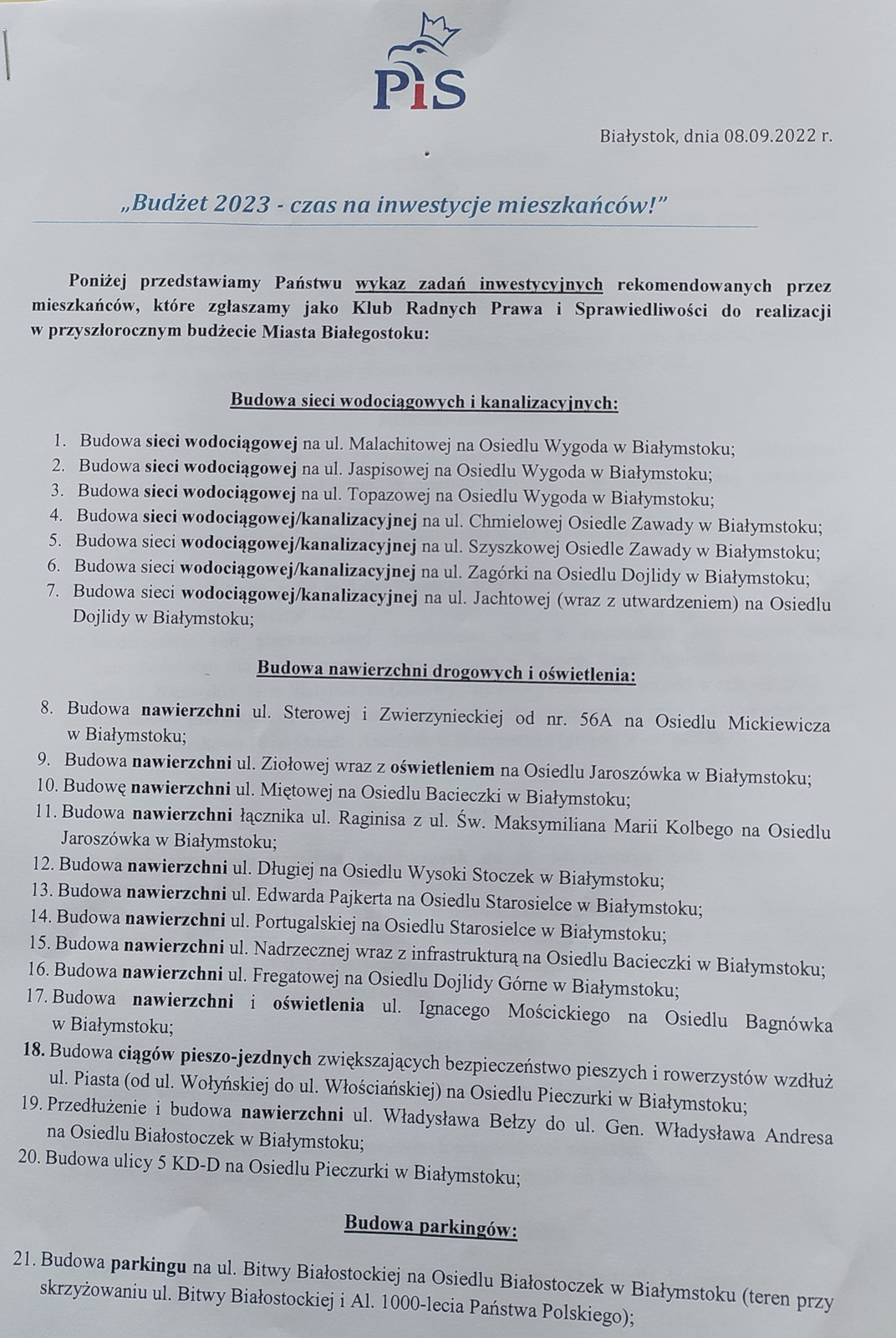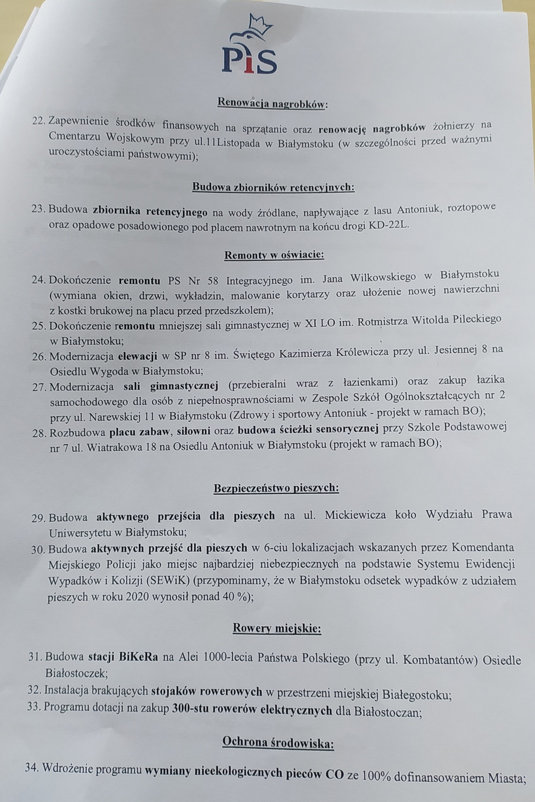 To między innymi budowa sieci wodociągowo-kanalizacyjnej na Dojlidach, utwardzenie ulicy Nadrzecznej, czy budowa dużego parkingu na osiedlu Białostoczek. Radni PiS proponują też budowę kilku aktywnych przejść dla pieszych oraz instalację nowych stojaków rowerowych i stworzenie programu dofinansowania do zakupu rowerów elektrycznych. Wśród propozycji znalazł się też program wymiany nieekologicznych źródeł ogrzewania oraz budowa strzelnicy niezbędnej do nauki obsługi broni.