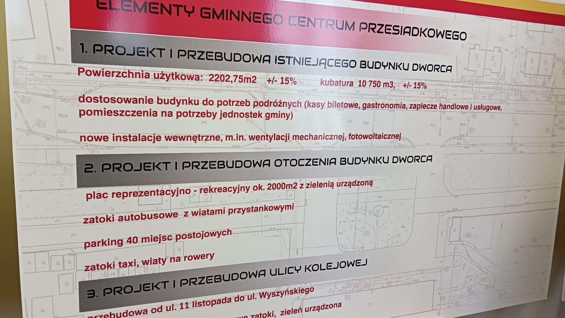 W samym budynku dworca będą m.in. poczekalnia, lokale gastronomiczne, pomieszczenia biurowe i toalety, zaś dookoła parkingi, wiaty rowerowe, ławki, latarnie, kosze na śmieci i kwietniki.