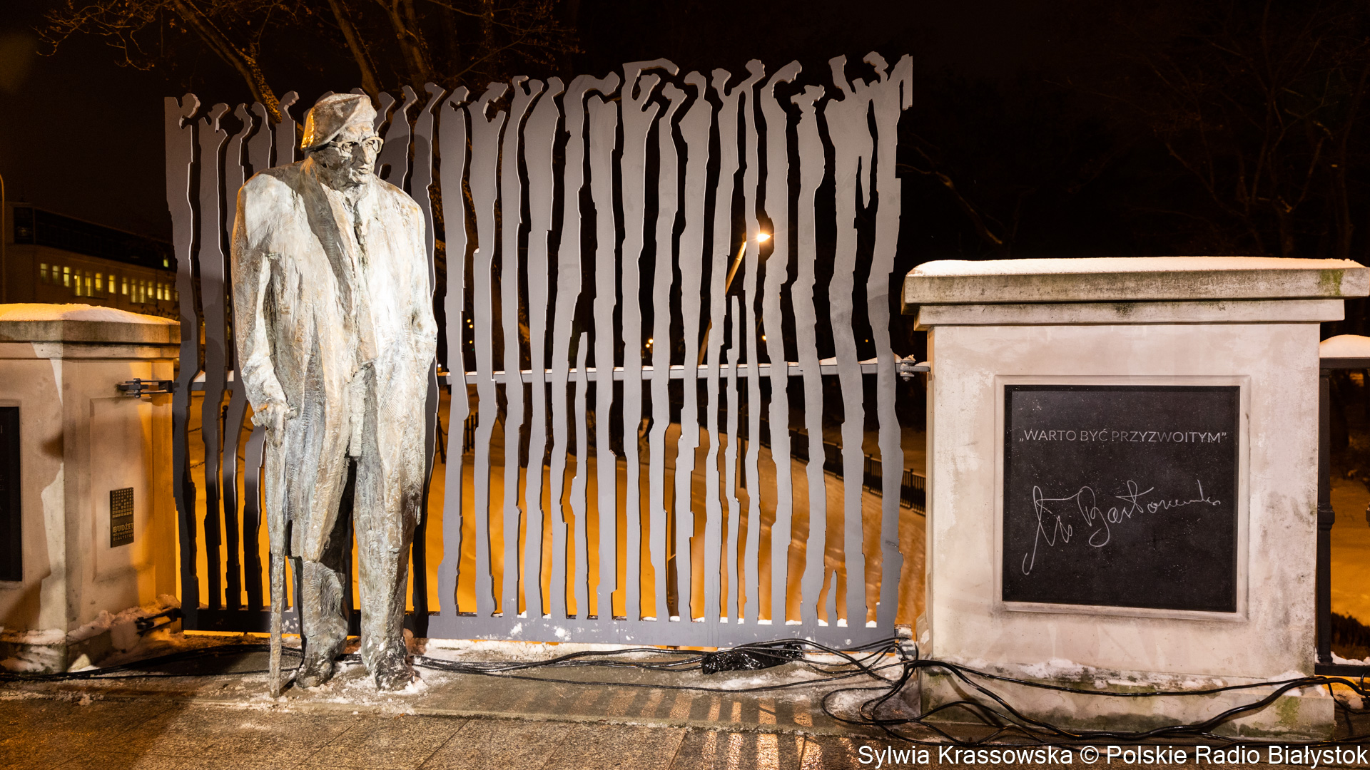 Oparta o laskę postać naturalnych rozmiarów stojąca na moście i tablica z napisem "Warto być przyzwoitym". Tak wygląda pomnik upamiętniający Władysława Bartoszewskiego, który w poniedziałek (12.12) oficjalnie odsłonięto w Białymstoku.