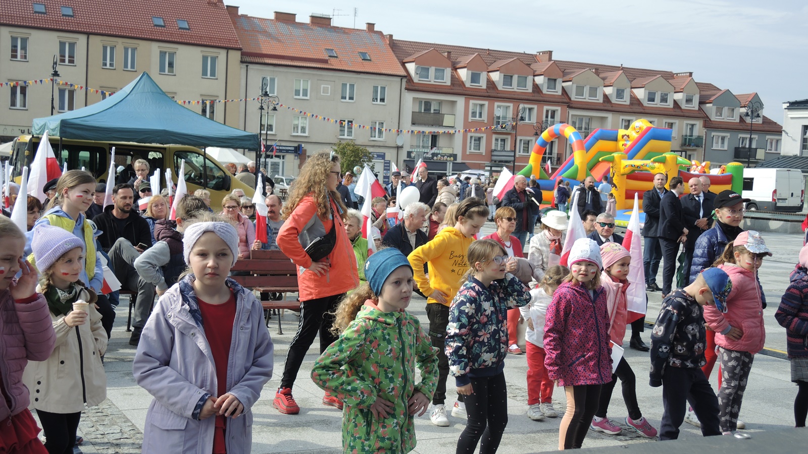 Atrakcje przygotowano głównie dla najmłodszych. Były lody i wata cukrowa w barwach narodowych. Można było wziąć udział w zabawach animowanych ze sceny i w konkursach, namalować sobie biało-czerwoną flagę na twarzy, a szczególnym powodzeniem cieszyły się – bezpłatne tego dnia – duże dmuchane zabawki. Starsi mogli wysłuchać występów, a świętowanie rozpoczęto od rozdania chętnym kilkuset flag na drzewcach i chorągiewek w barwach narodowych.