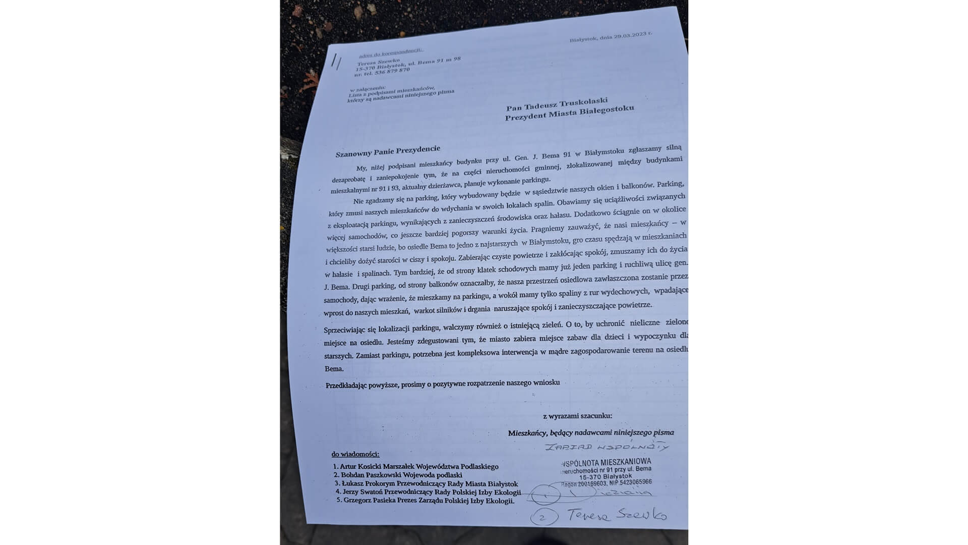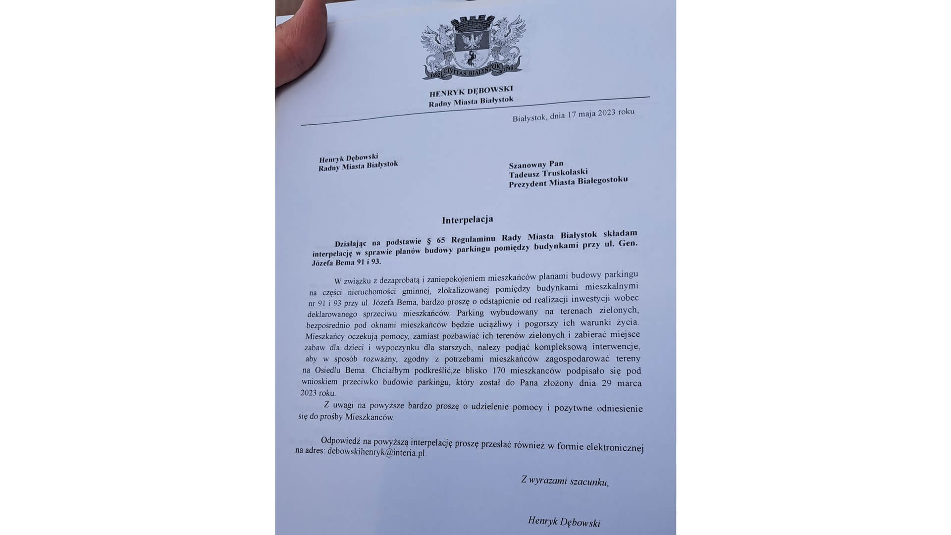 Interpelację napisał do prezydenta Białegostoku radny PiS Henryk Dębowski: "z prośbą o wsłuchanie się w głosy protestujących mieszkańców i poszukanie innego terenu, by wyznaczyć miejsca parkingowe, których wiadomo, że też brakuje".