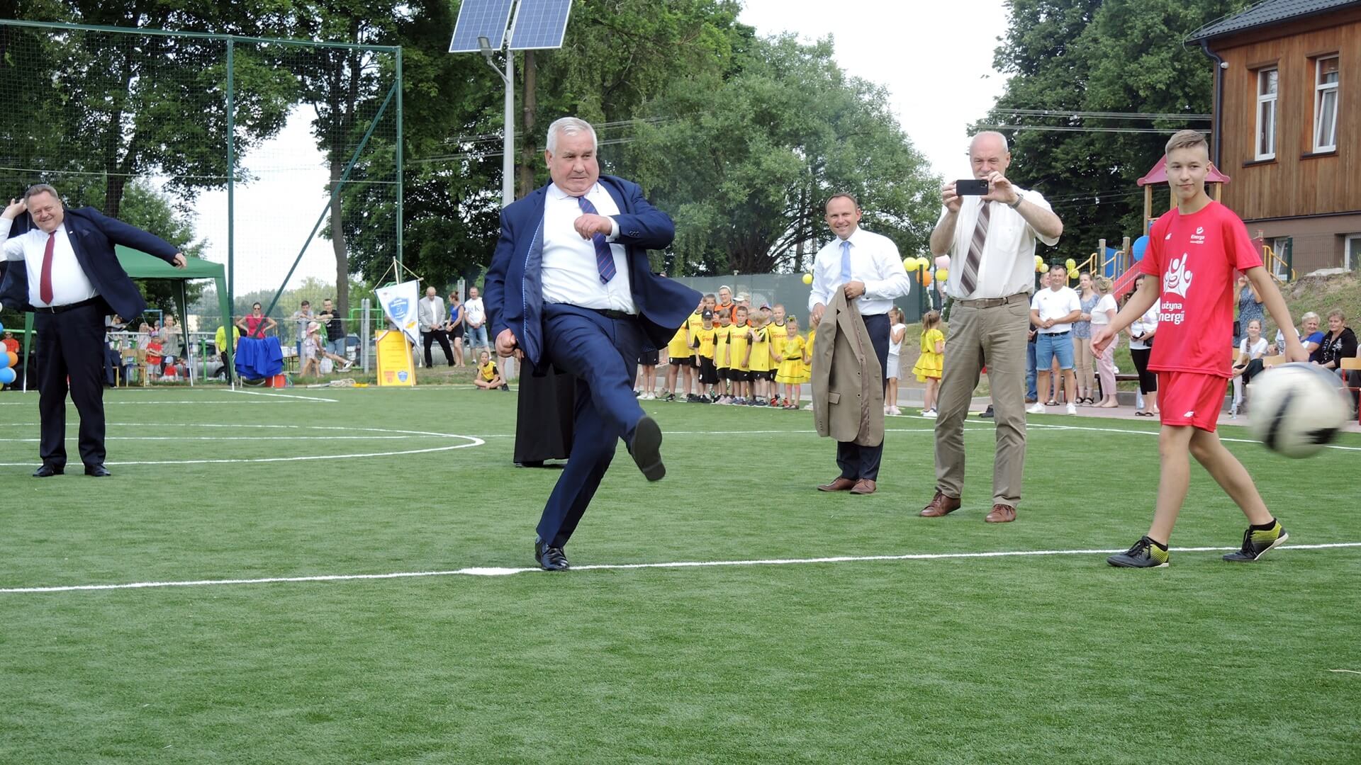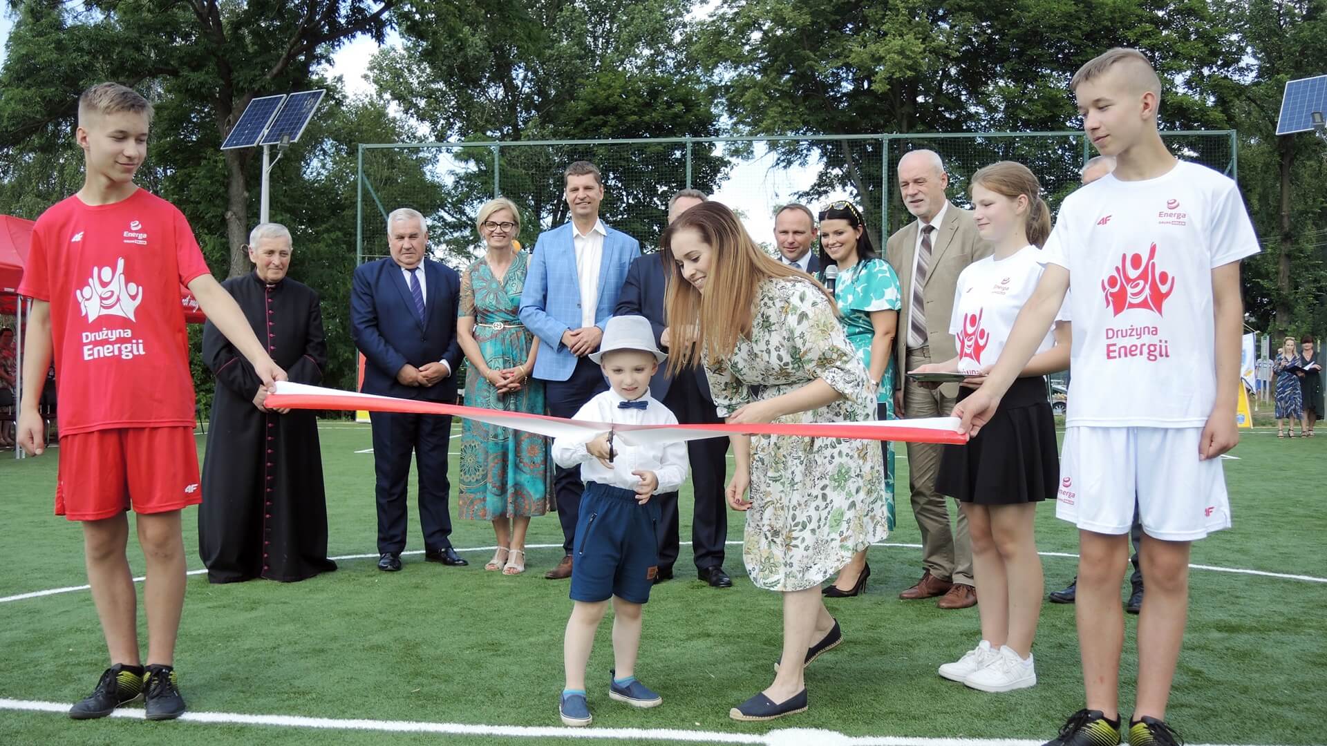 Symbolicznego otwarcia boiska przez przecięcie biało- czerwonej wstęgi dokonał Wiktor - najmłodszy uczeń z grupy przedszkolnej w tej szkole.