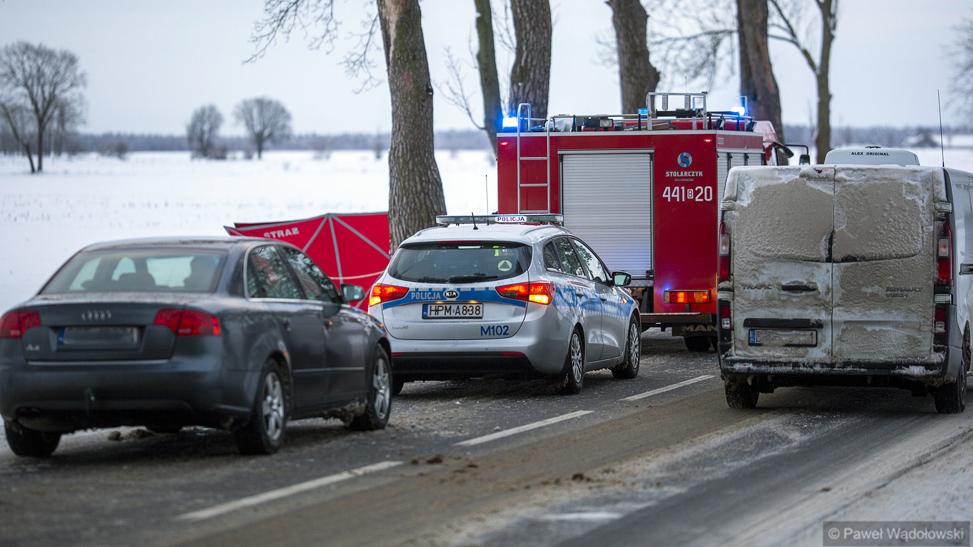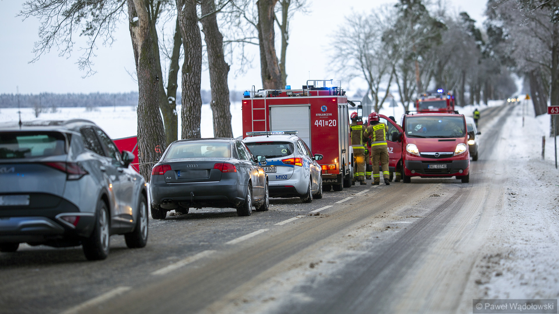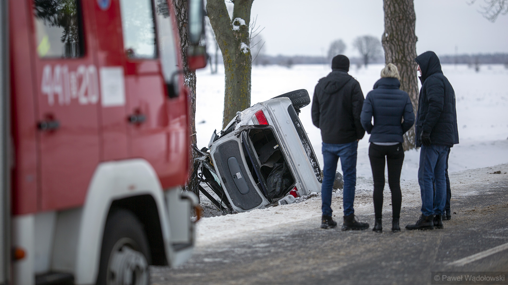 Przy skrzyżowaniu z drogą w kierunku Stawisk samochód osobowy najprawdopodobniej wpadł w poślizg podczas wyprzedzania i uderzył w drzewo. W wyniku wypadku zginął jeden z pasażerów. To 24-letni mężczyzna. Drugi pasażer i kierowca nie odnieśli poważniejszych obrażeń. Pierwsze informacje mówiły, że był to pojazd wojskowy, ale według najświeższych ustaleń był to cywilny samochód, którym jechało trzech żołnierzy.