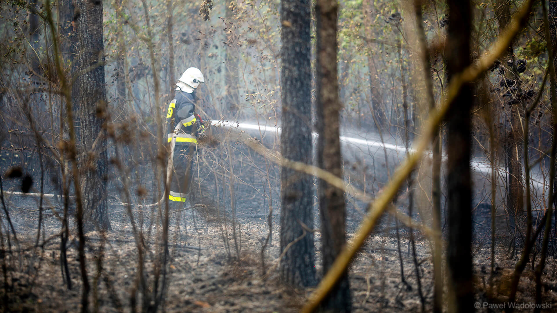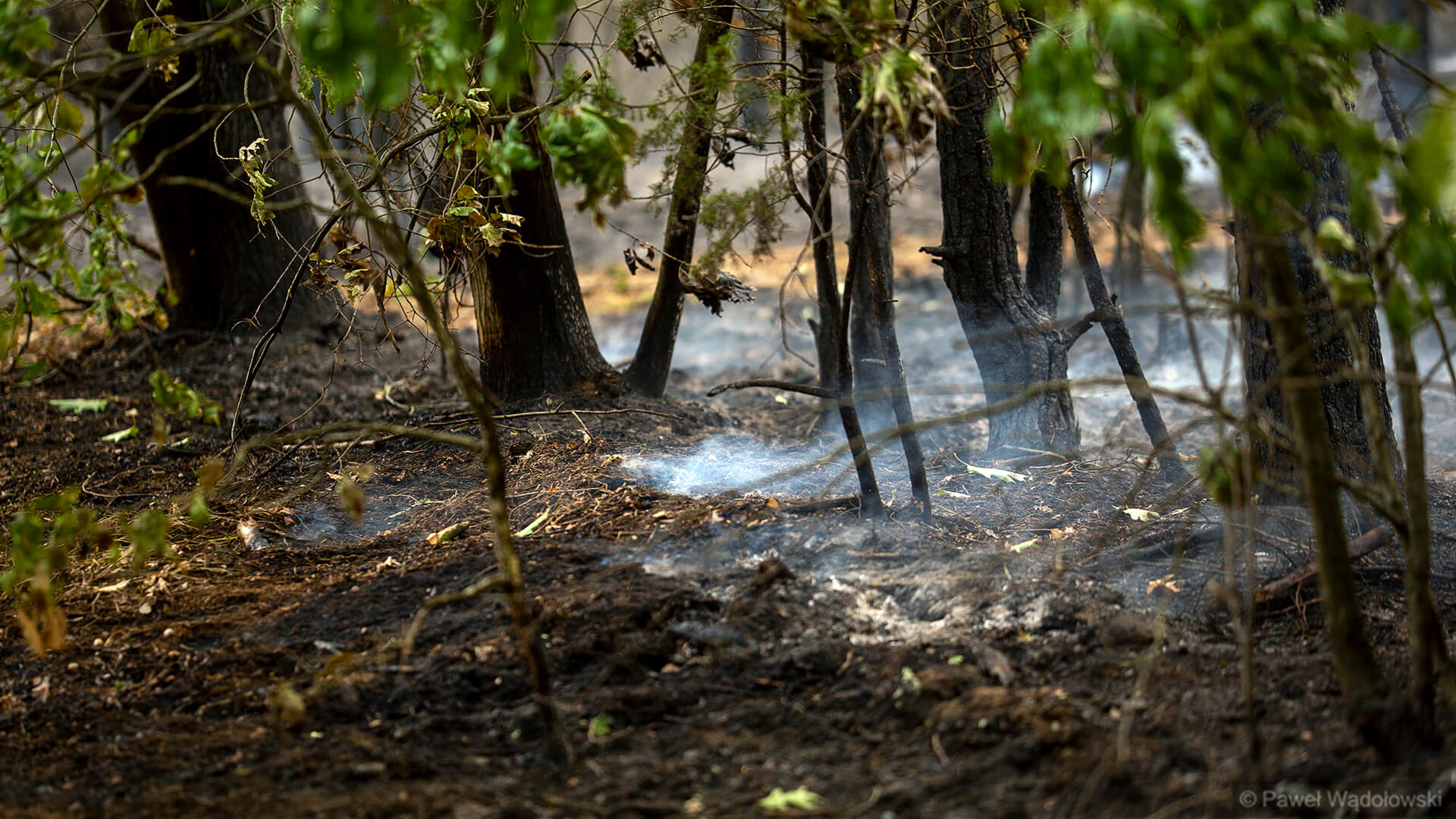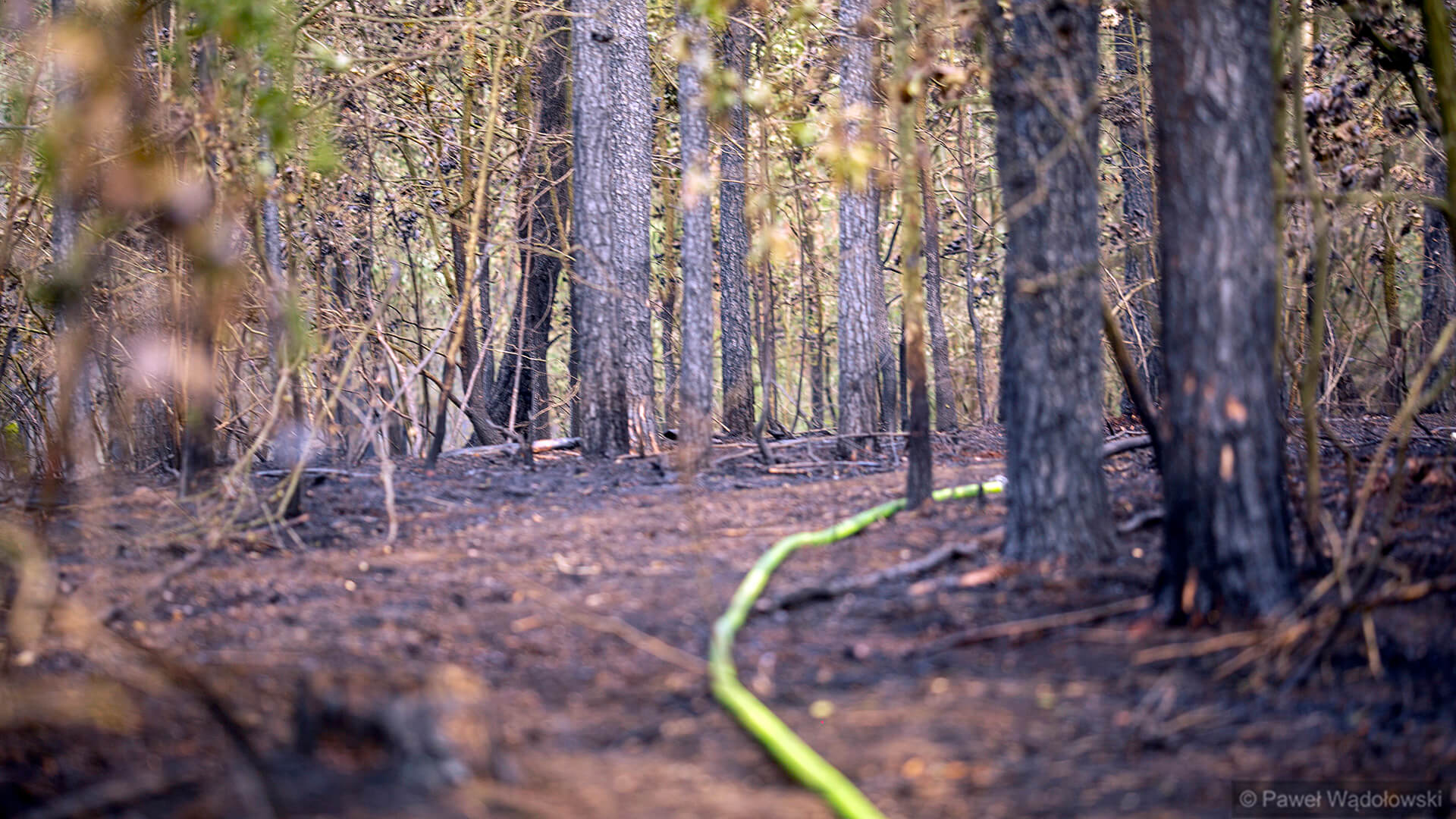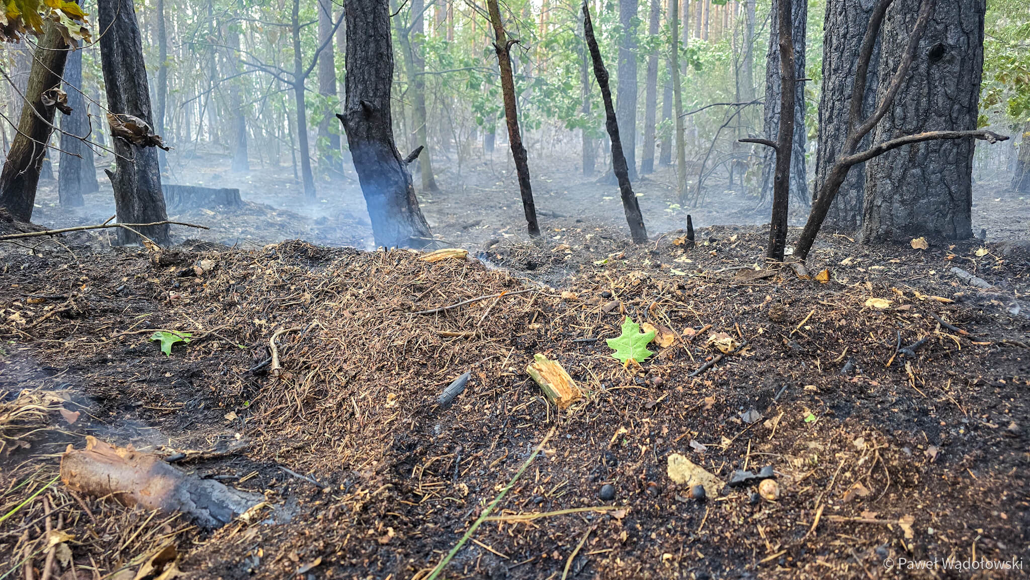 Część strażaków zostanie na pogorzelisku do rana. Muszą przelewać ściółkę, bo w wielu miejscach cały czas pojawia się ogień.