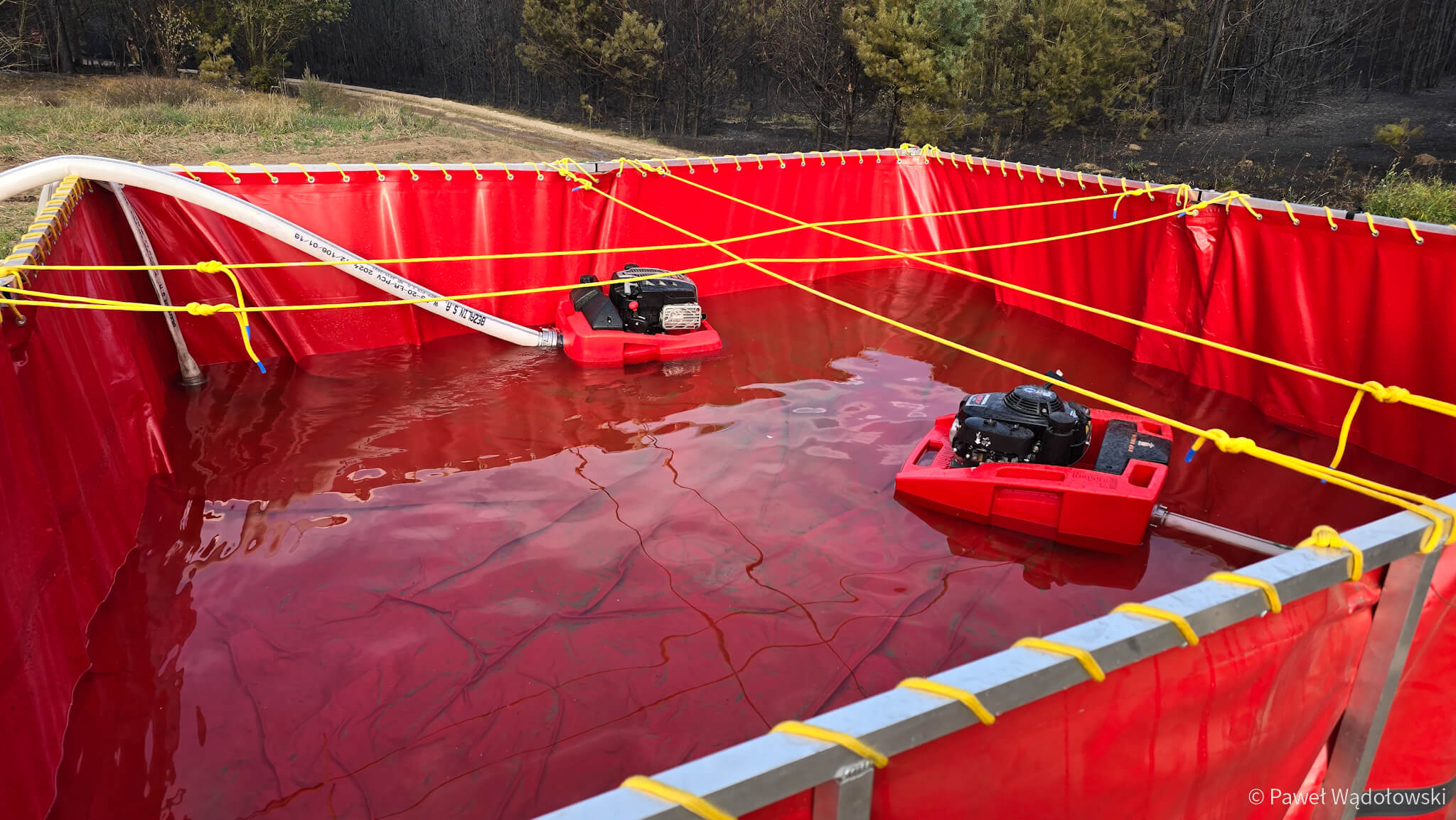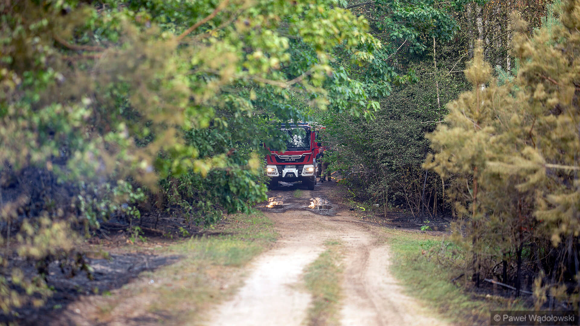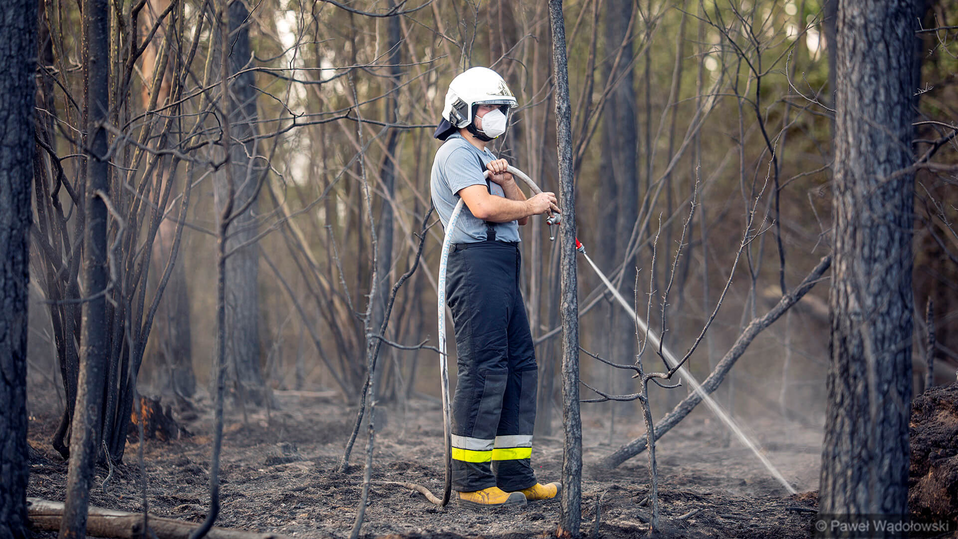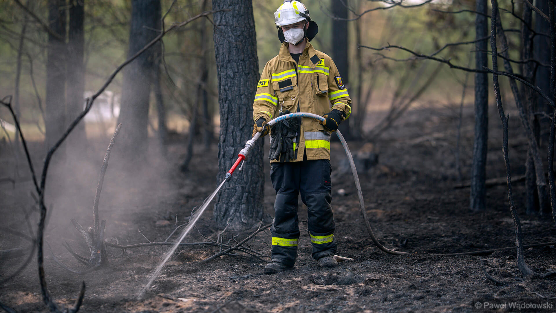 Część strażaków zostanie na pogorzelisku do rana. Muszą przelewać ściółkę, bo w wielu miejscach cały czas pojawia się ogień.