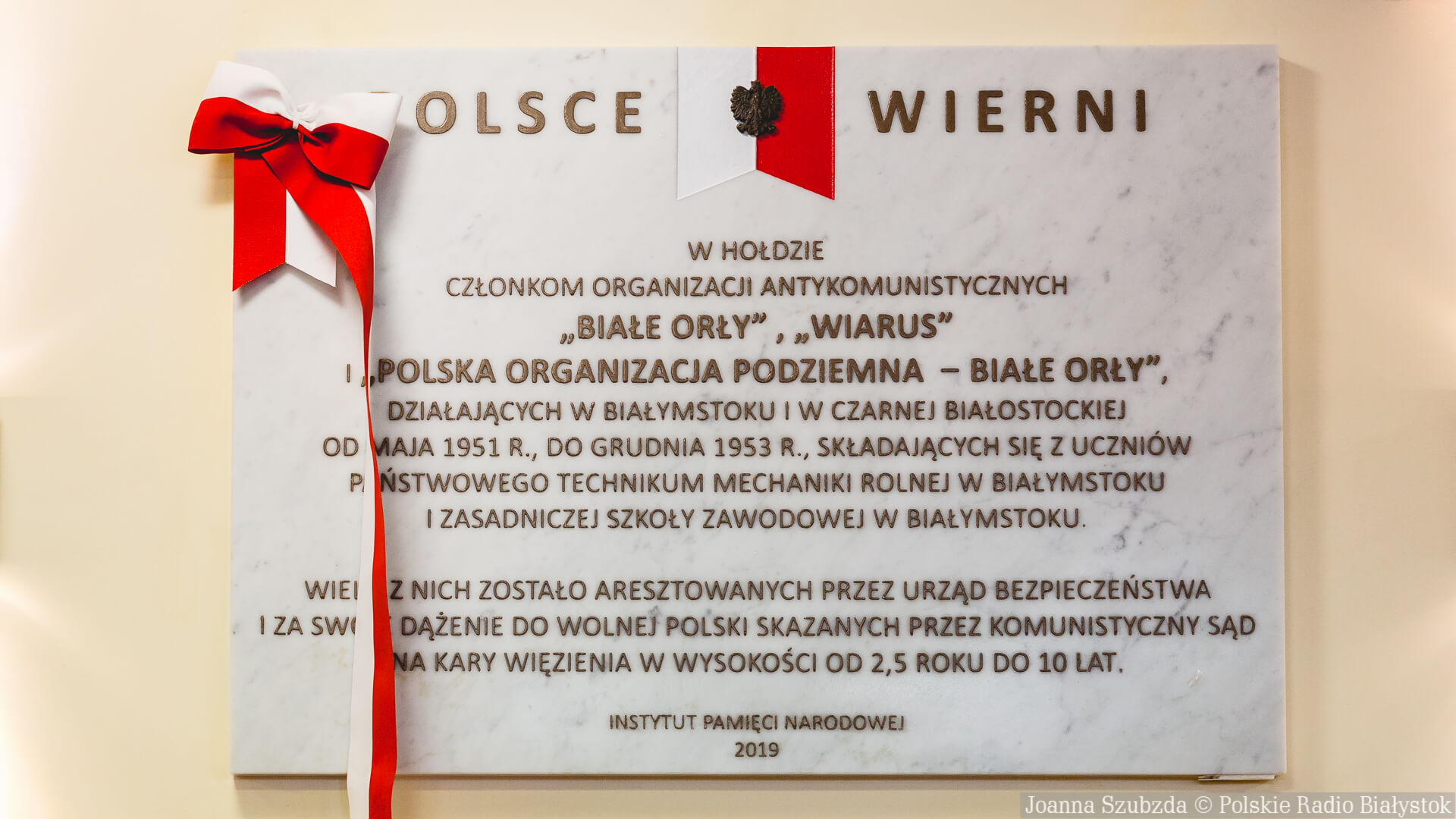 Tablica upamiętnia członków organizacji antykomunistycznych "Białe Orły", "Wiarus" i „Polska Organizacja Podziemna - Białe Orły". Od maja 1951 roku do grudnia 1953 roku działały one w Białymstoku i w Czarnej Białostockiej; należeli do nich uczniowie Państwowego Technikum Mechaniki Rolnej w Białymstoku i Zasadniczej Szkoły Zawodowej w Białymstoku.
