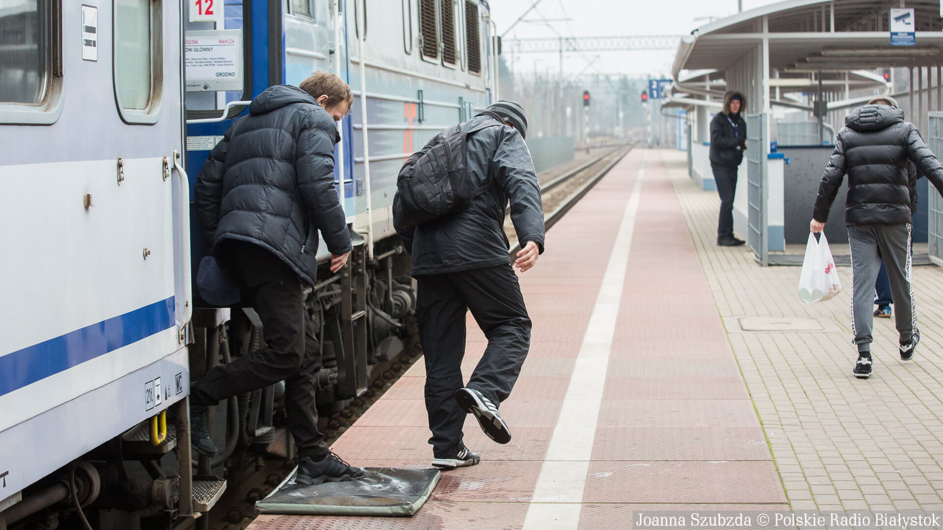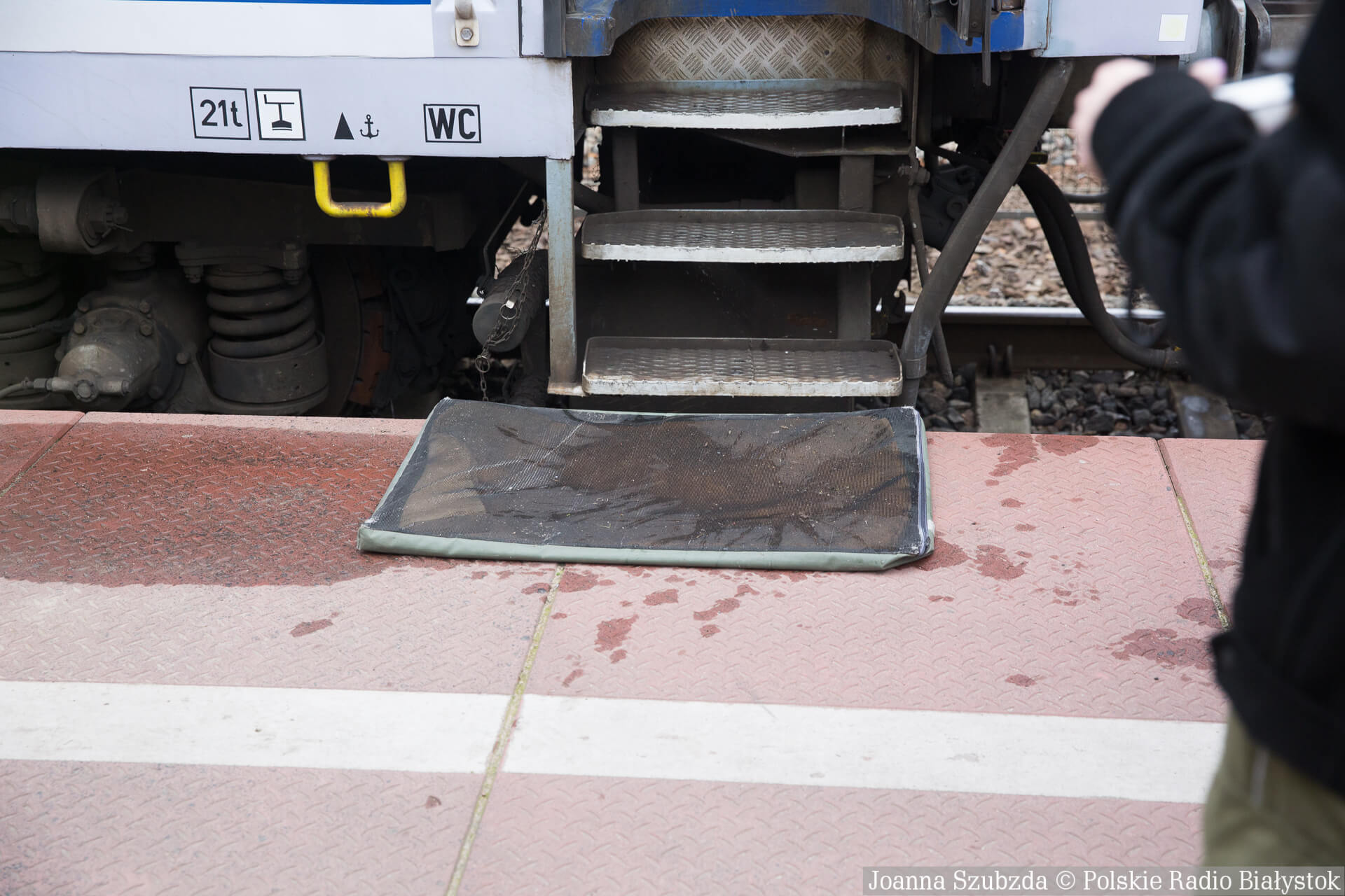 Dodatkowo, każdy z pasażerów, po wyjściu z pociągu musiał przejść przez przez matę nawilżoną płynem dezynfekcyjnym - to z kolei zabezpieczenie przed ASF-em.
